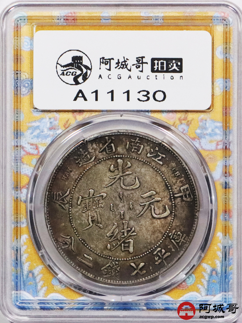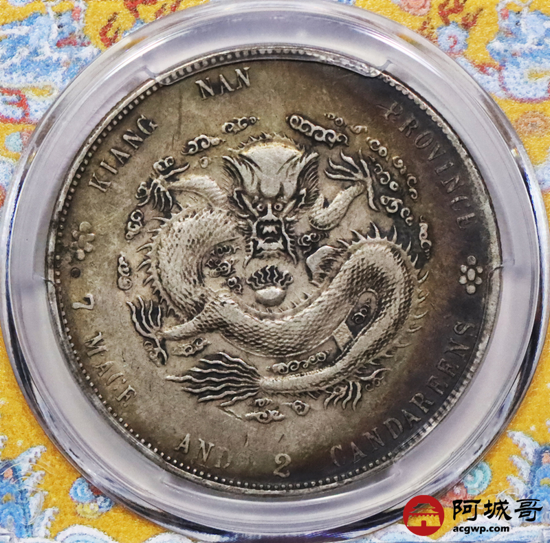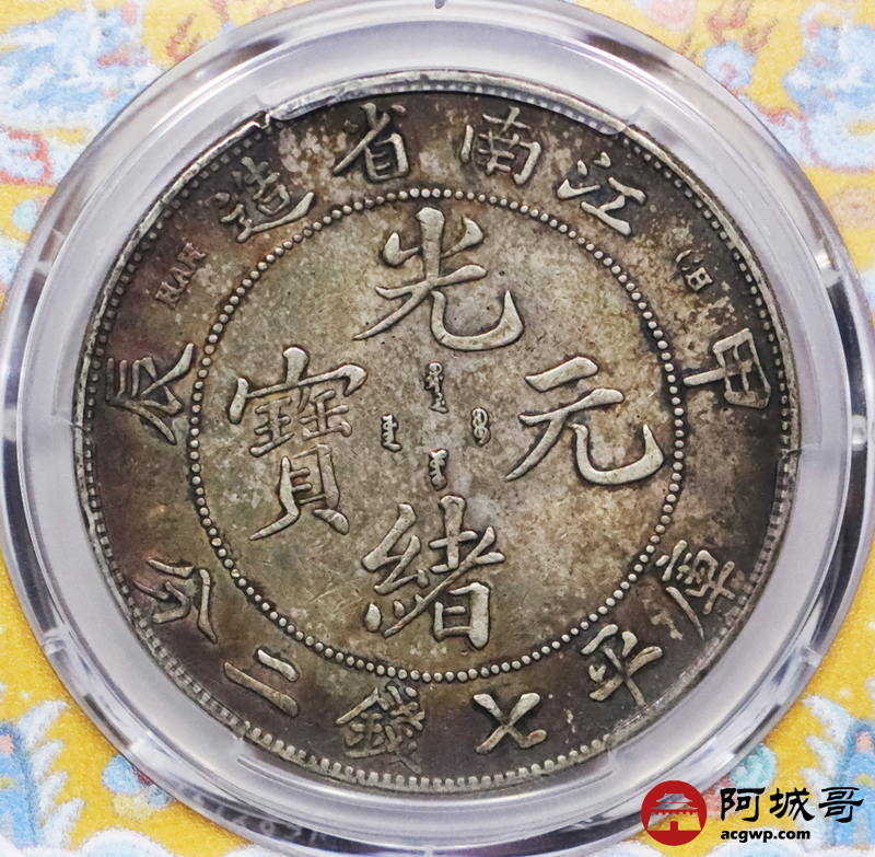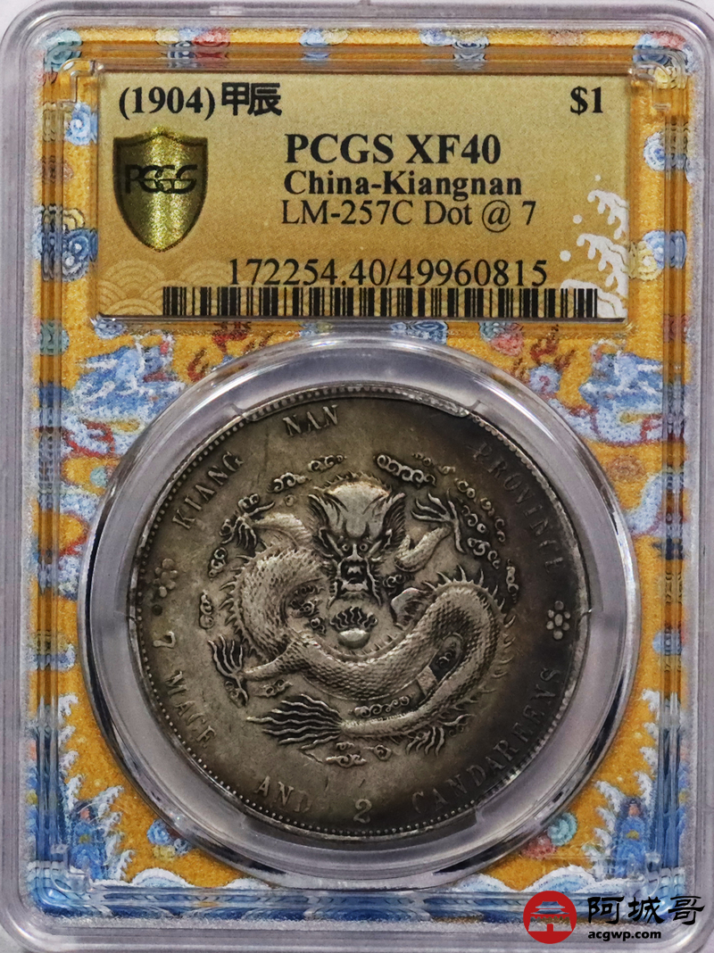 Lot:3380 1904江南省造甲辰年光绪元宝库平七钱二分银币一枚,卷首月牙彩,卷尾酱彩包浆PCGS XF40评级编号:49960815