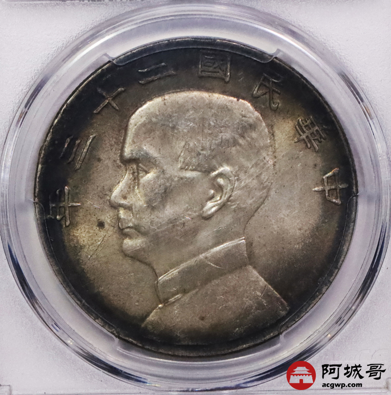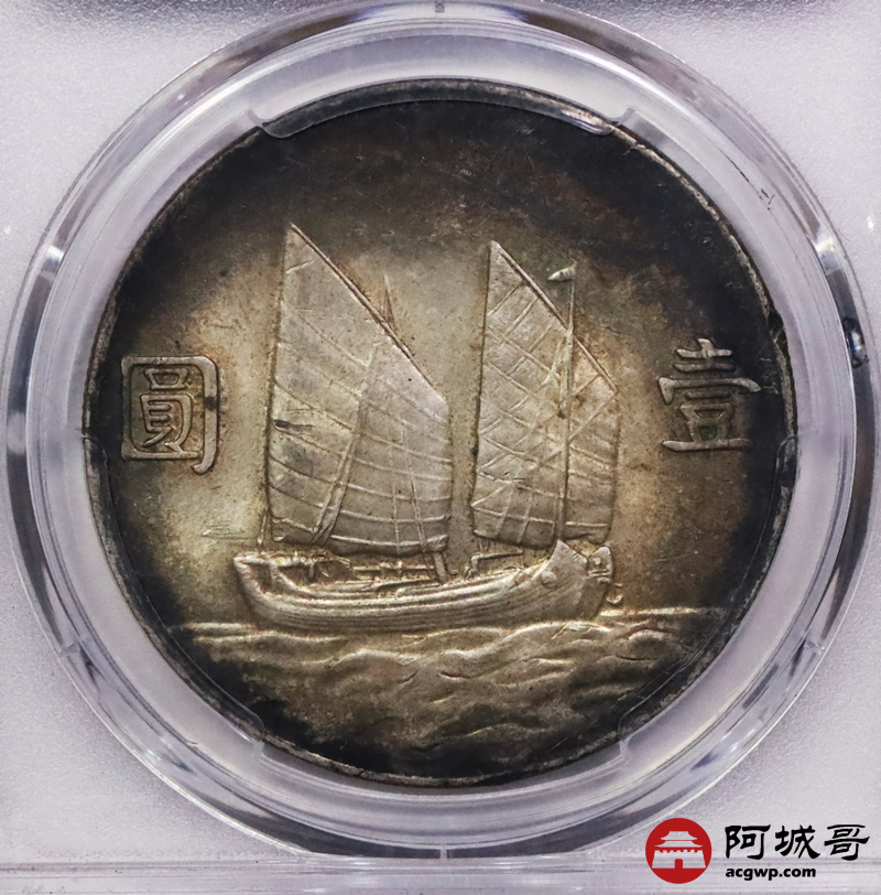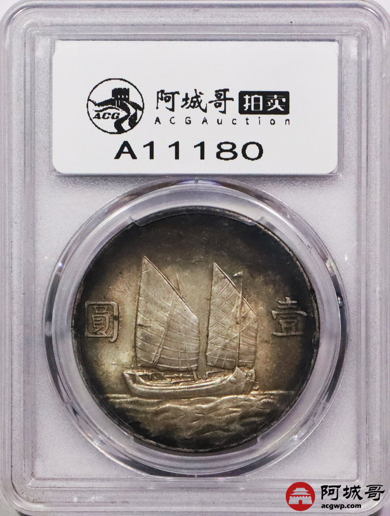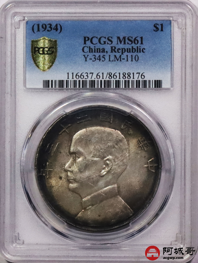 Lot:3572 1934民国二十三年孙中山像背帆船壹圆银币一枚,原光环五彩包浆PCGS MS61评级编号:86188176