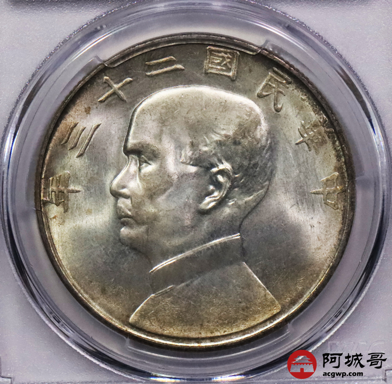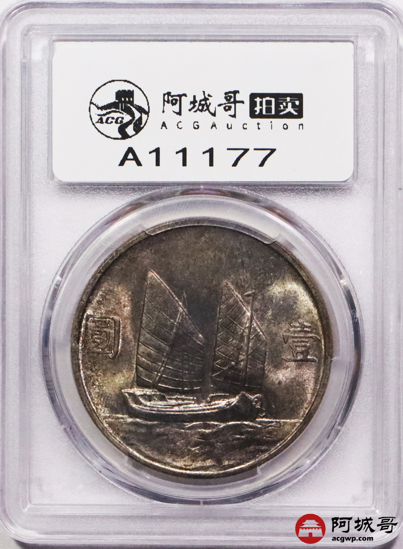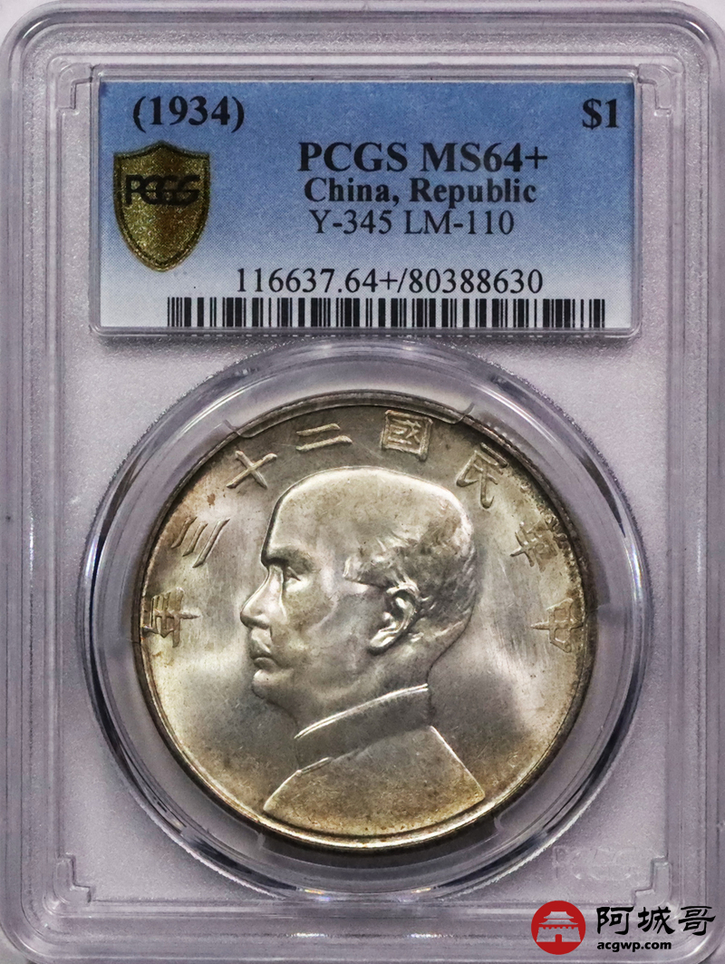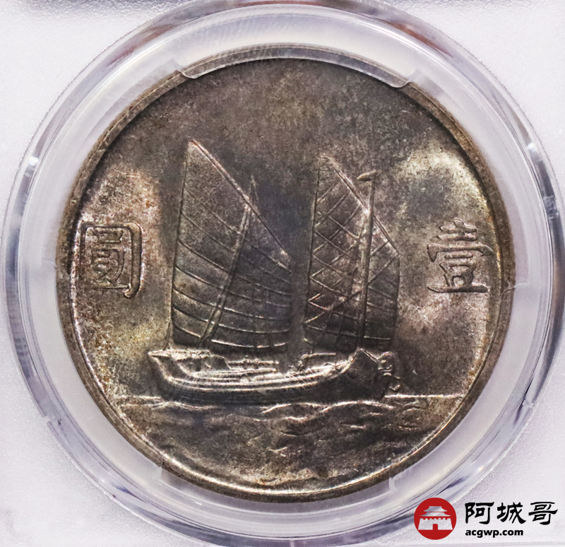 Lot:3553 1934民国二十三年孙中山像背帆船壹圆银币一枚,原光五彩包浆PCGS MS64+评级编号:80388630