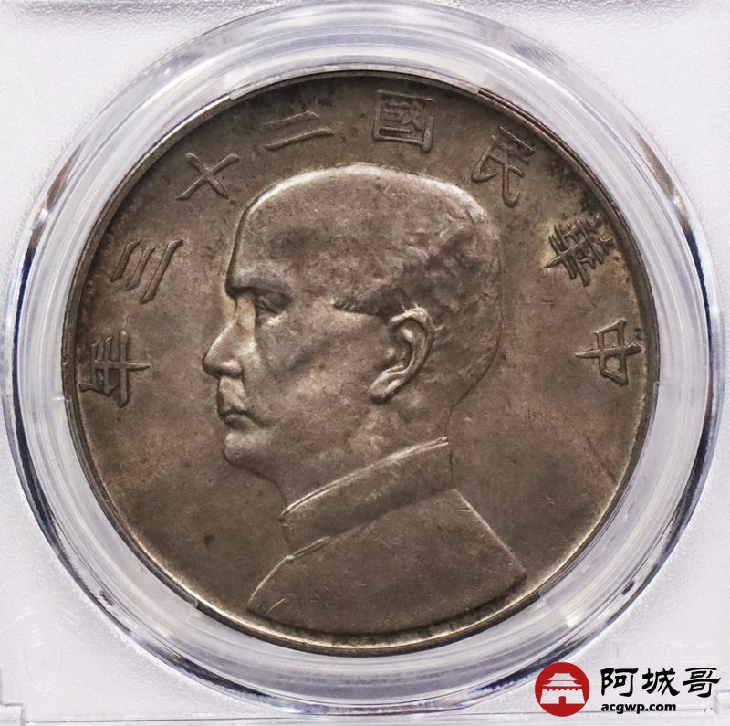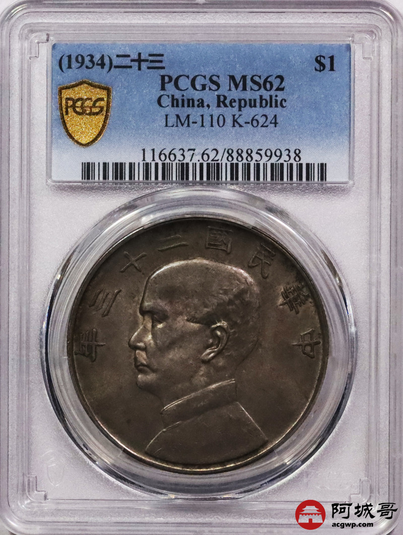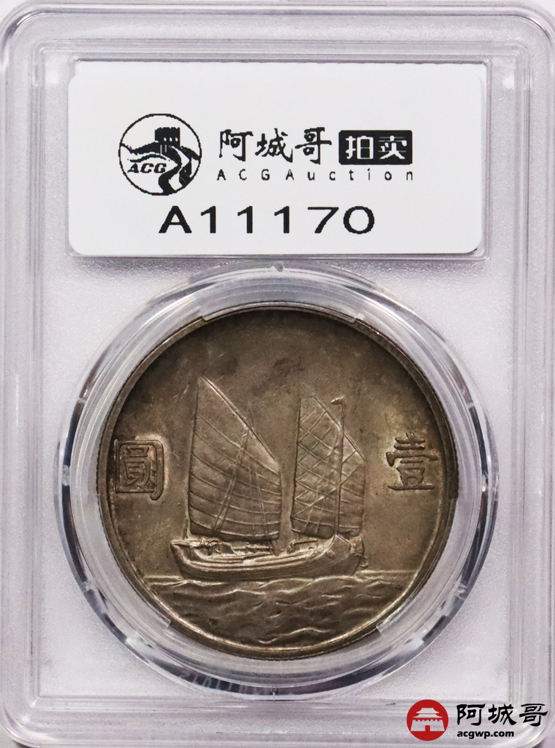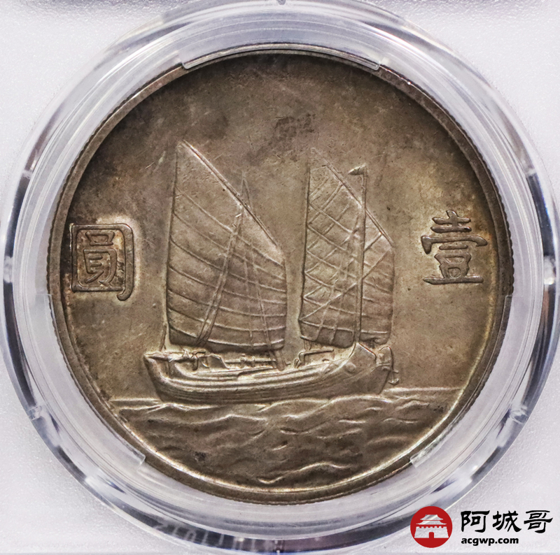 Lot:3570 1934民国二十三年孙中山像背帆船壹圆银币一枚,重黄油酱彩包浆 PCGS MS62评级编号:88859938