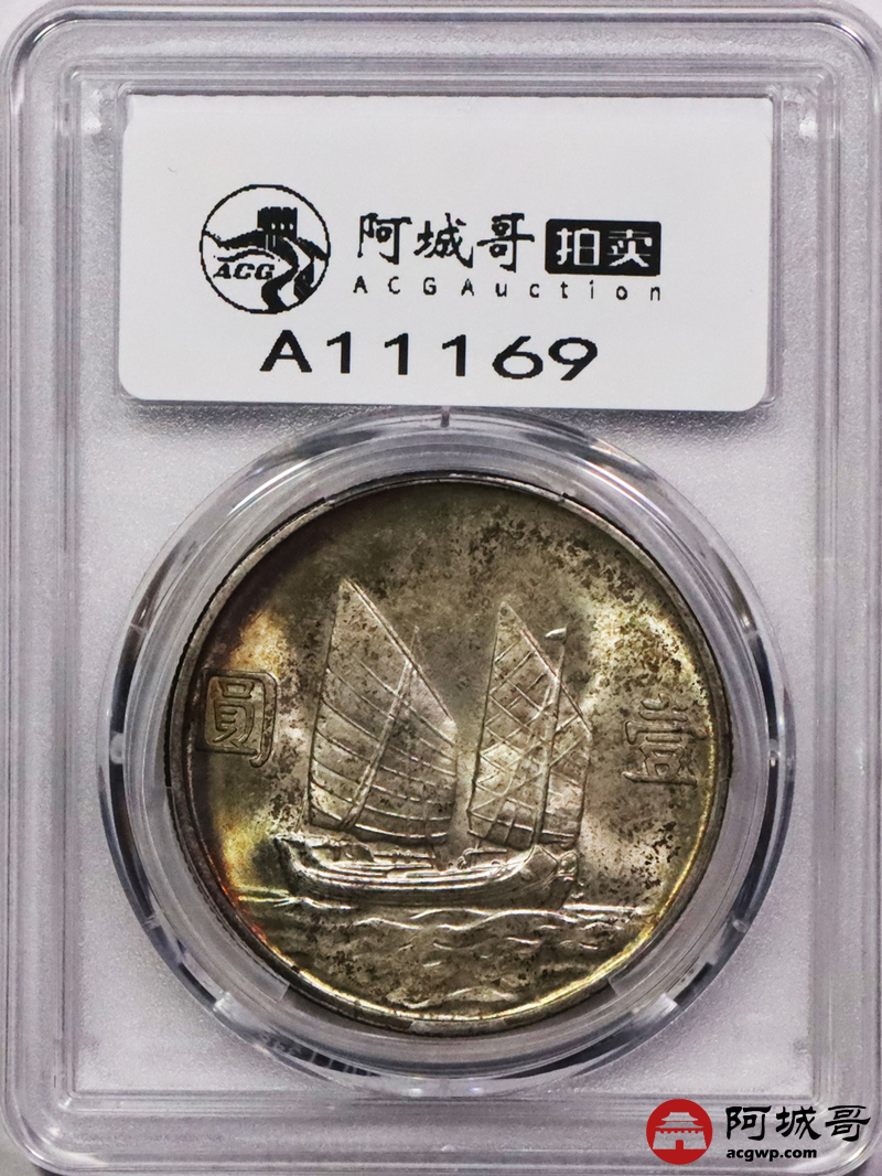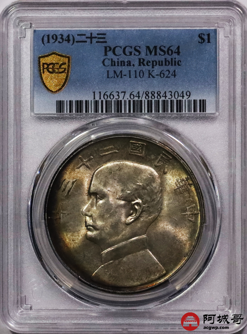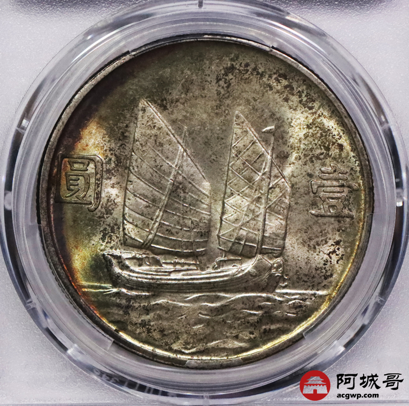 Lot:3555 1934民国二十三年孙中山像背帆船壹圆银币一枚,黄油原光五彩包浆PCGS MS64评级编号:88843049