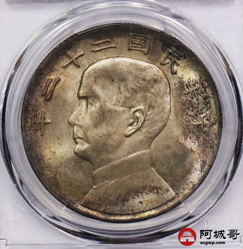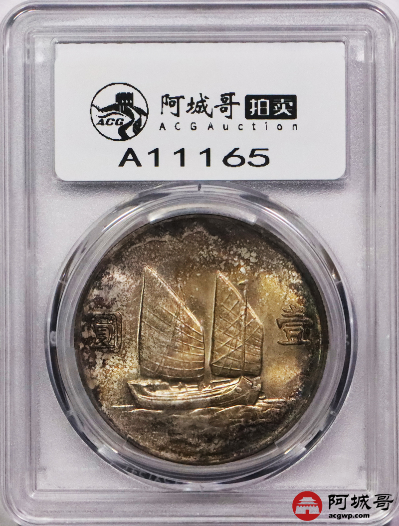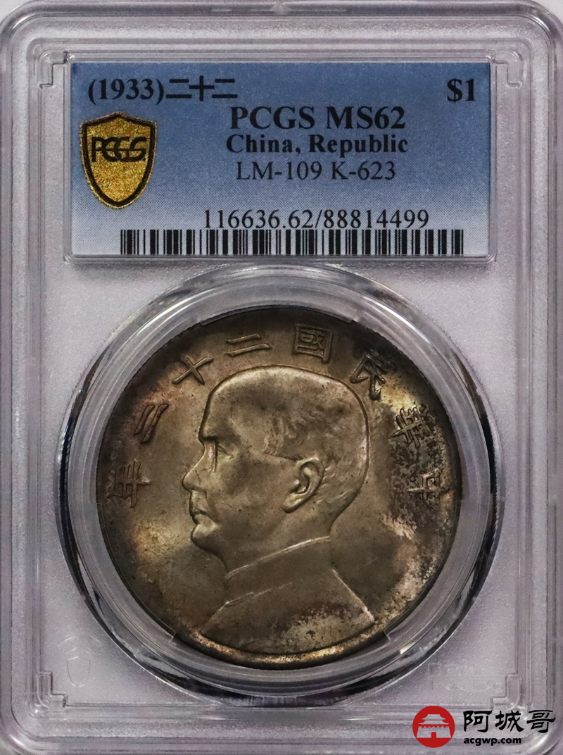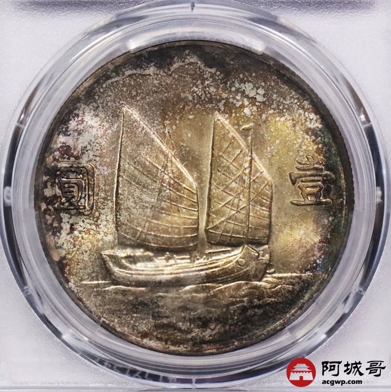 Lot:3198 1933民国二十二年孙中山像背帆船壹圆银币一枚,黄油原光五彩包浆PCGS MS62评级编号:88814499