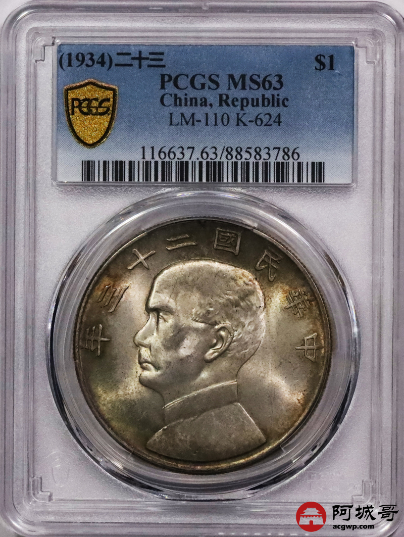 Lot:3565 1934民国二十三年孙中山像背帆船壹圆银币一枚,黄油原光PCGS MS63评级编号:88583786