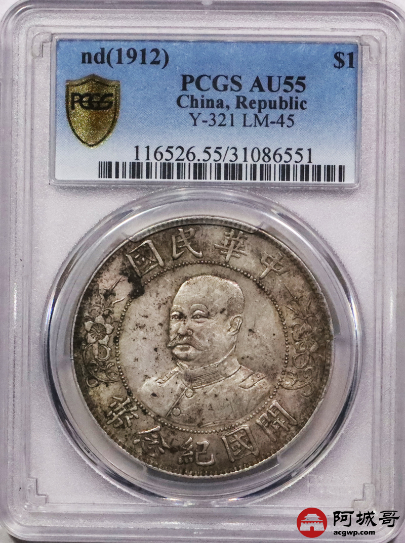 Lot:3097 1912黎元洪像无帽开国纪念壹圆银币一枚,原汁原味,黄油底光 PCGS AU55 评级编号:31086551