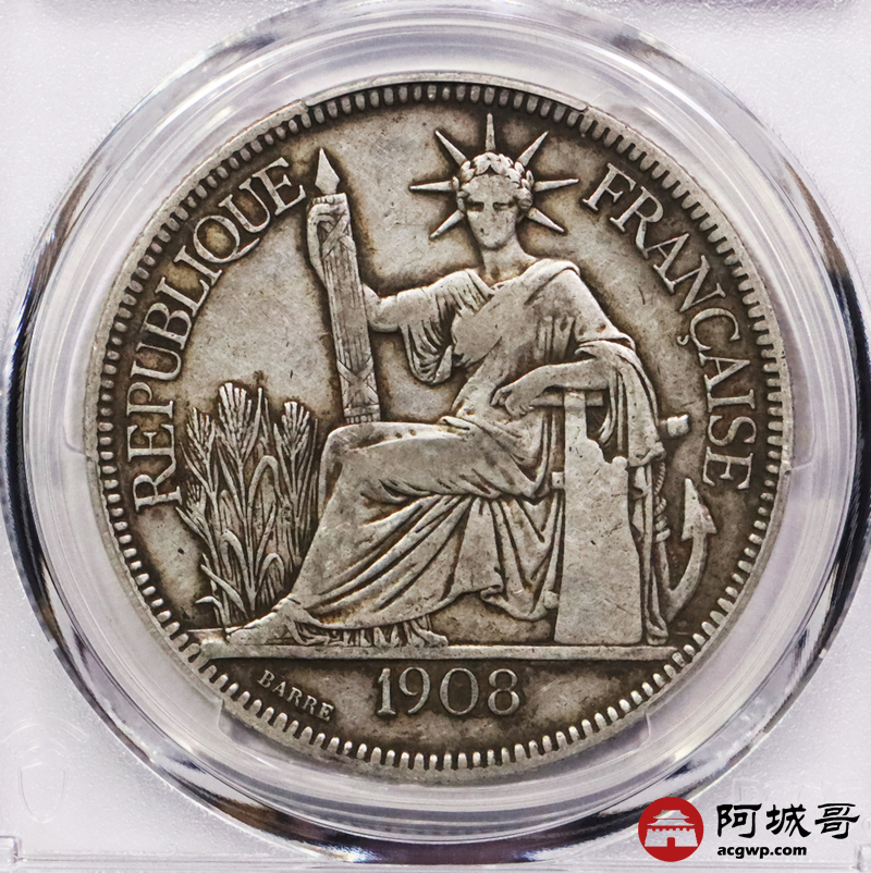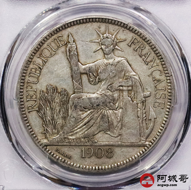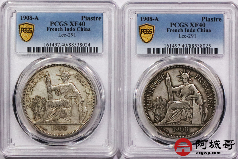 Lot:3755 1908A法属印支银币坐洋两枚,原味 PCGS XF40 评级编号:88538025-88538024