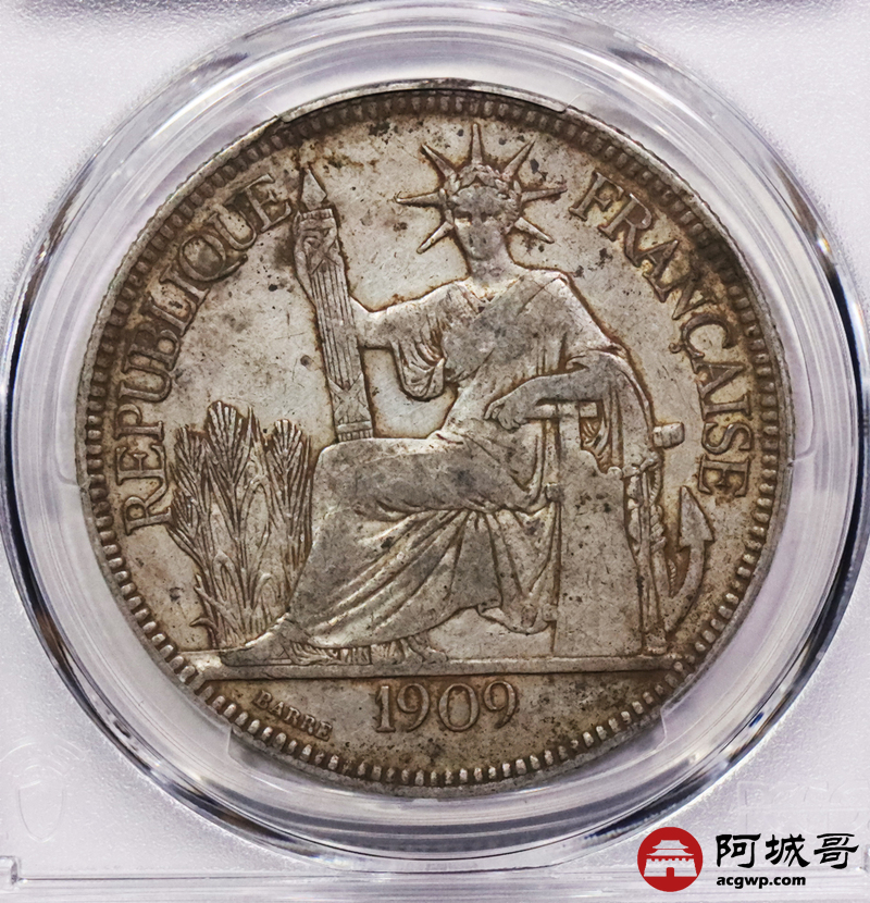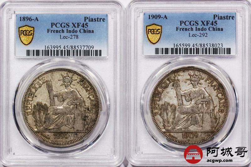Lot:3756 1896A/1909A法属印支银币坐洋两枚,原味 PCGS XF45 评级编号:88537709-88538023