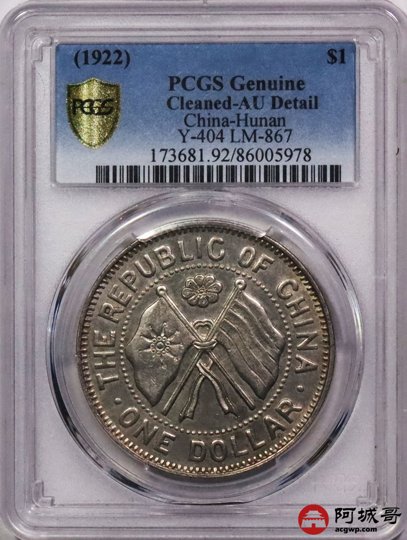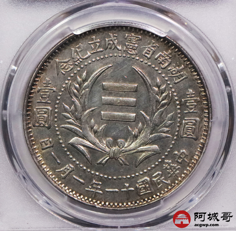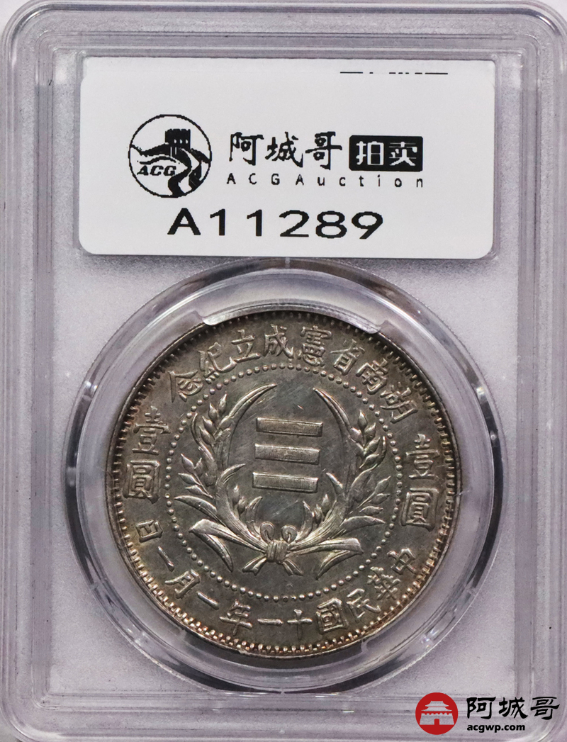 Lot:3184 1922民国十一年一月一日湖南省宪成立纪念壹圆银币一枚,黄油底板,铸打深俊有力,底板一流 PCGS AU 评级编号:86005978