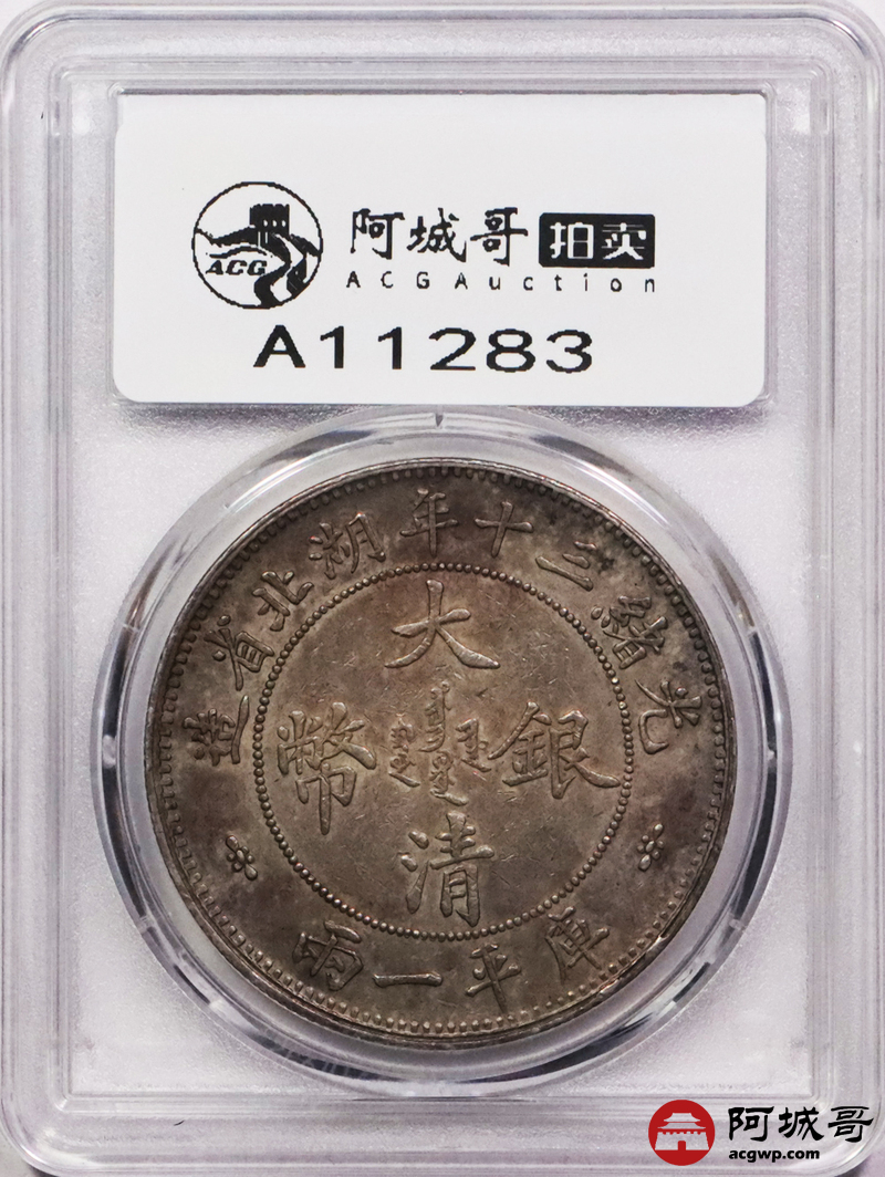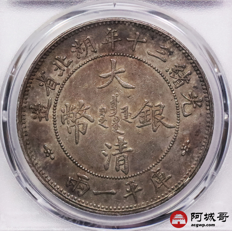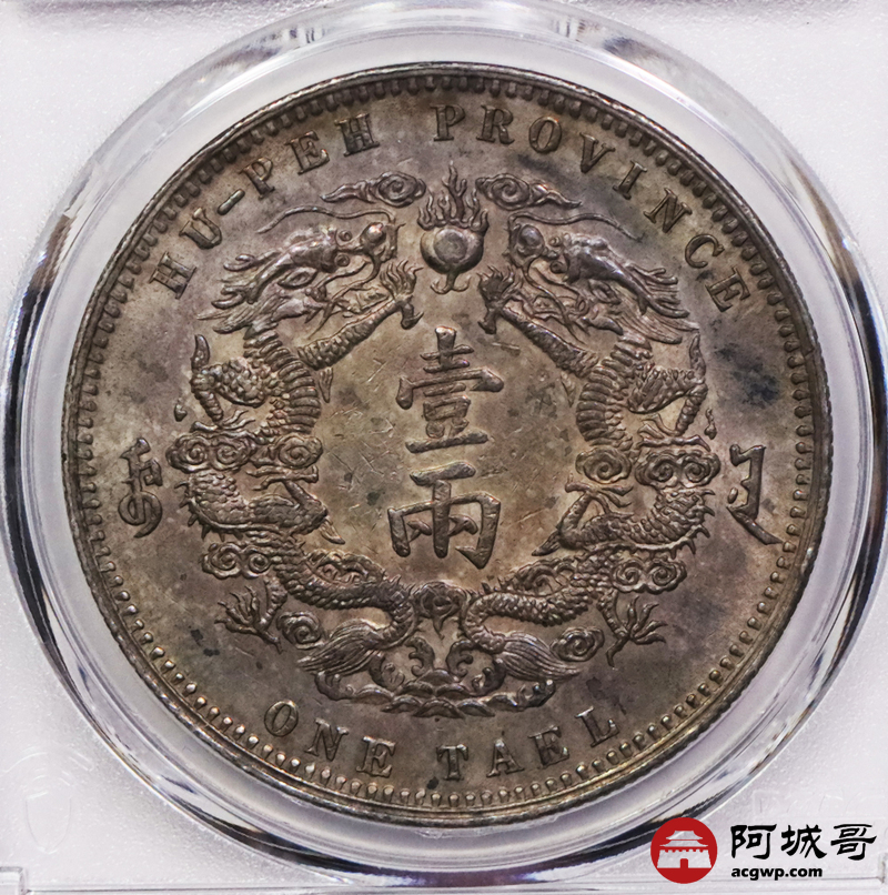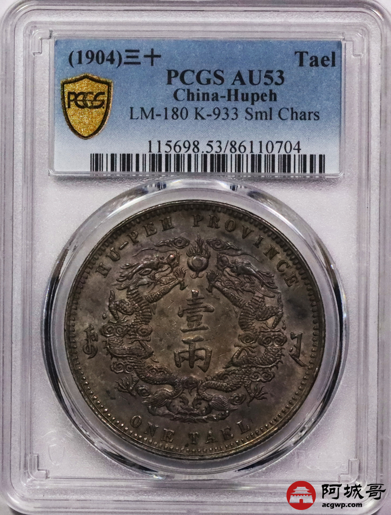 Lot:3083 1904光绪三十年湖北省造大清银币双龙一两银币一枚,小字版,机制币收藏不可或缺的品种,深受藏家的青睐,此枚铸打深俊,龙鳞饱满,字口立体,黄油五彩底板 ,状态上成 PCGS AU53评级编号:86110704