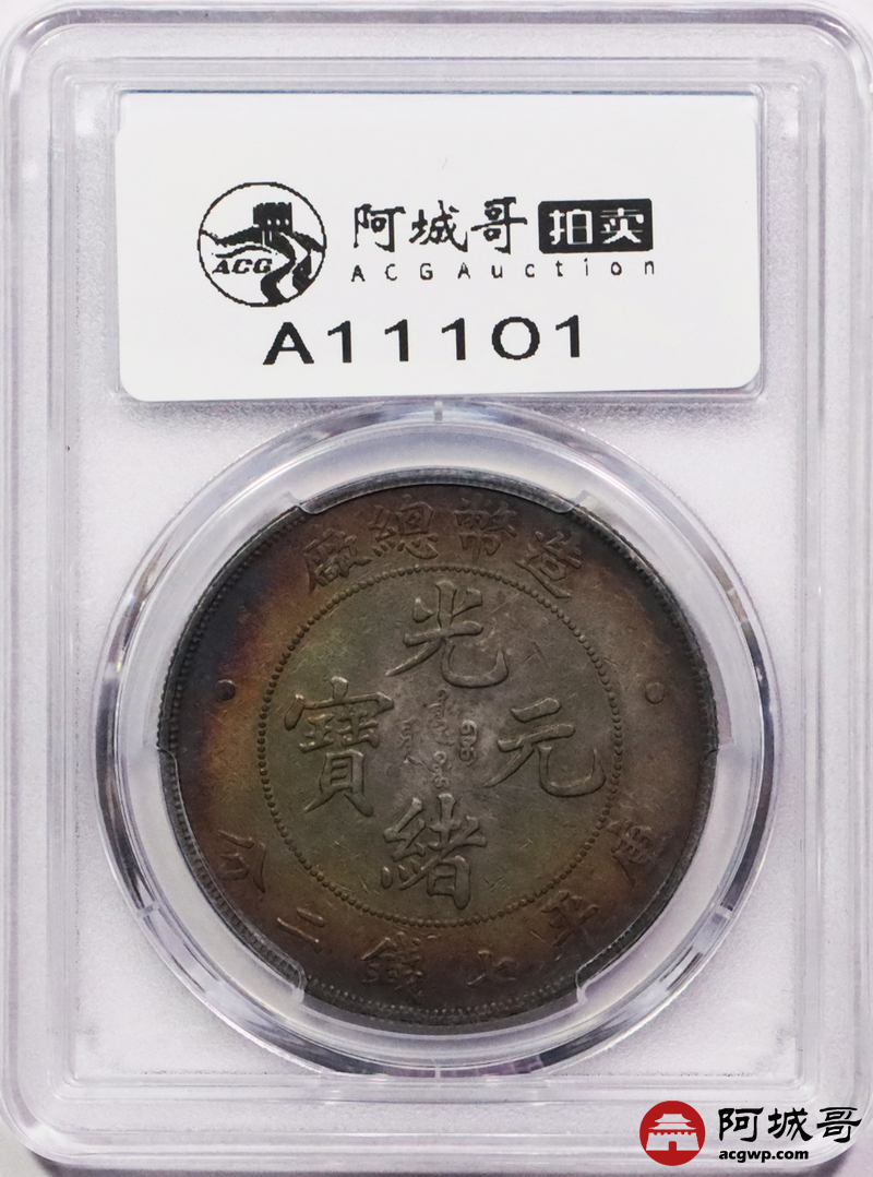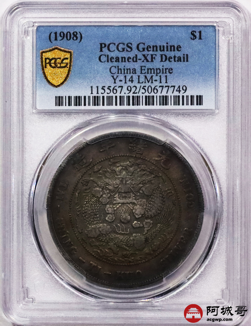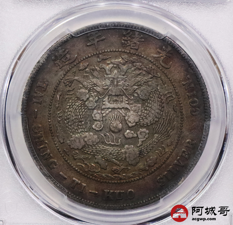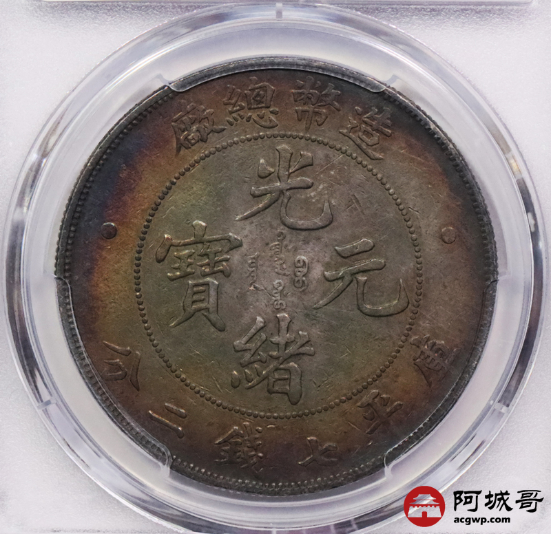 Lot:3007 1908光绪年造造币总厂光绪元宝库平七钱二分银币一枚,字口深打,双面酱彩包浆 PCGS XF评级编号:50677749