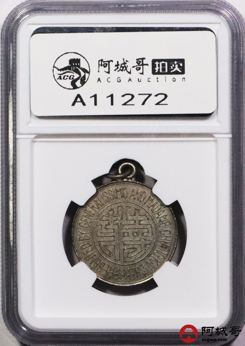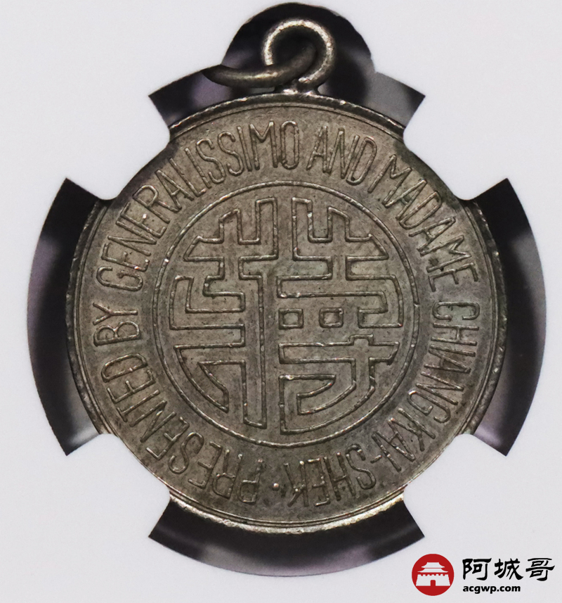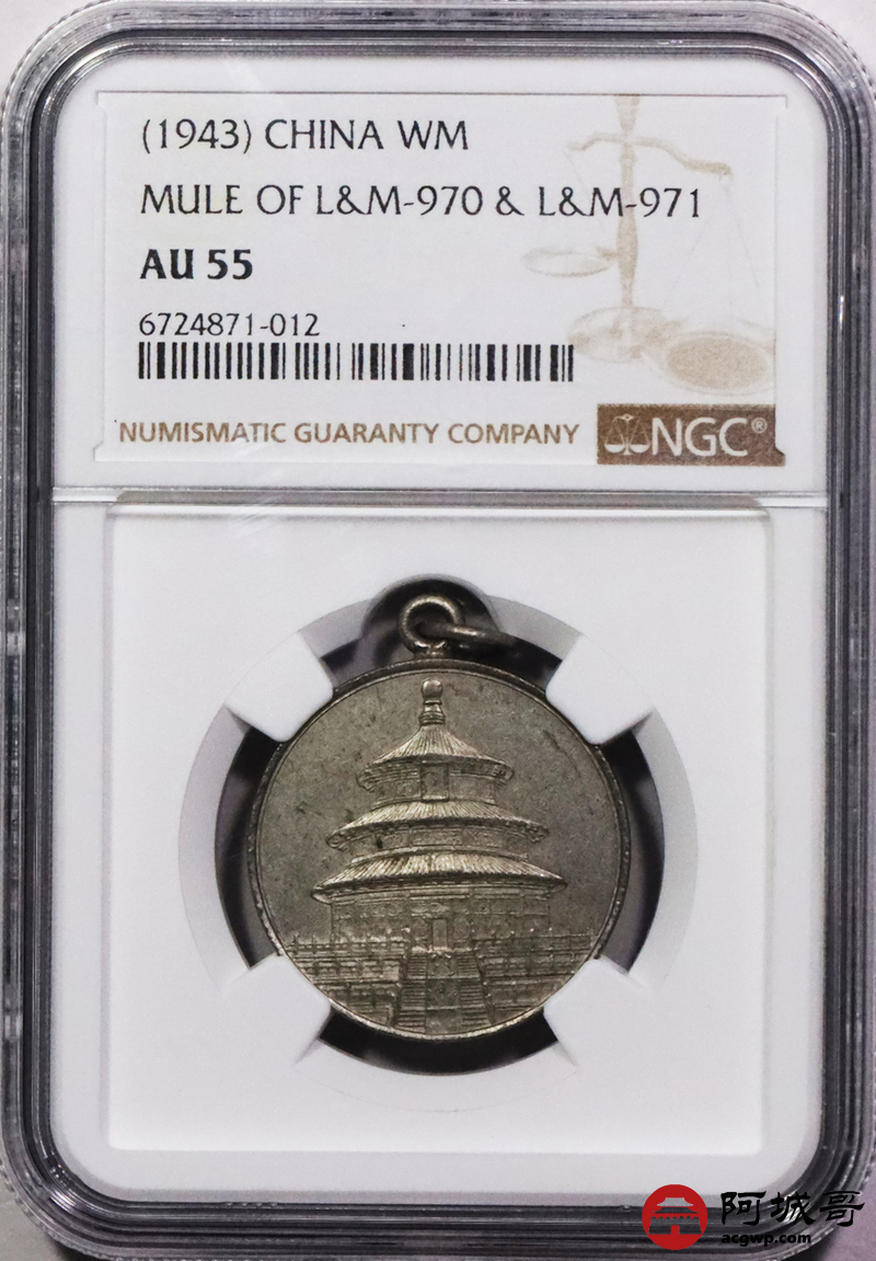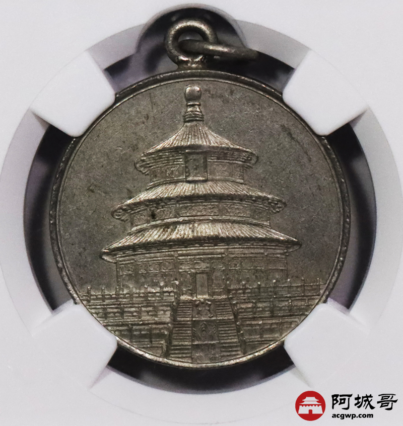 Lot:3439 1943年民国蒋字背天坛图铜镍纪念章,正面天坛,铸打佳丽,经手痕迹极少,细节保存较好NGC AU55评级编号:6724871-012