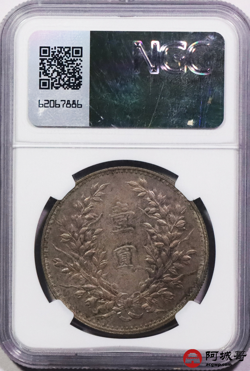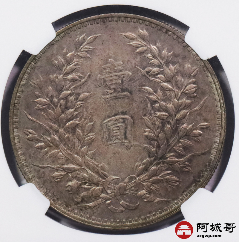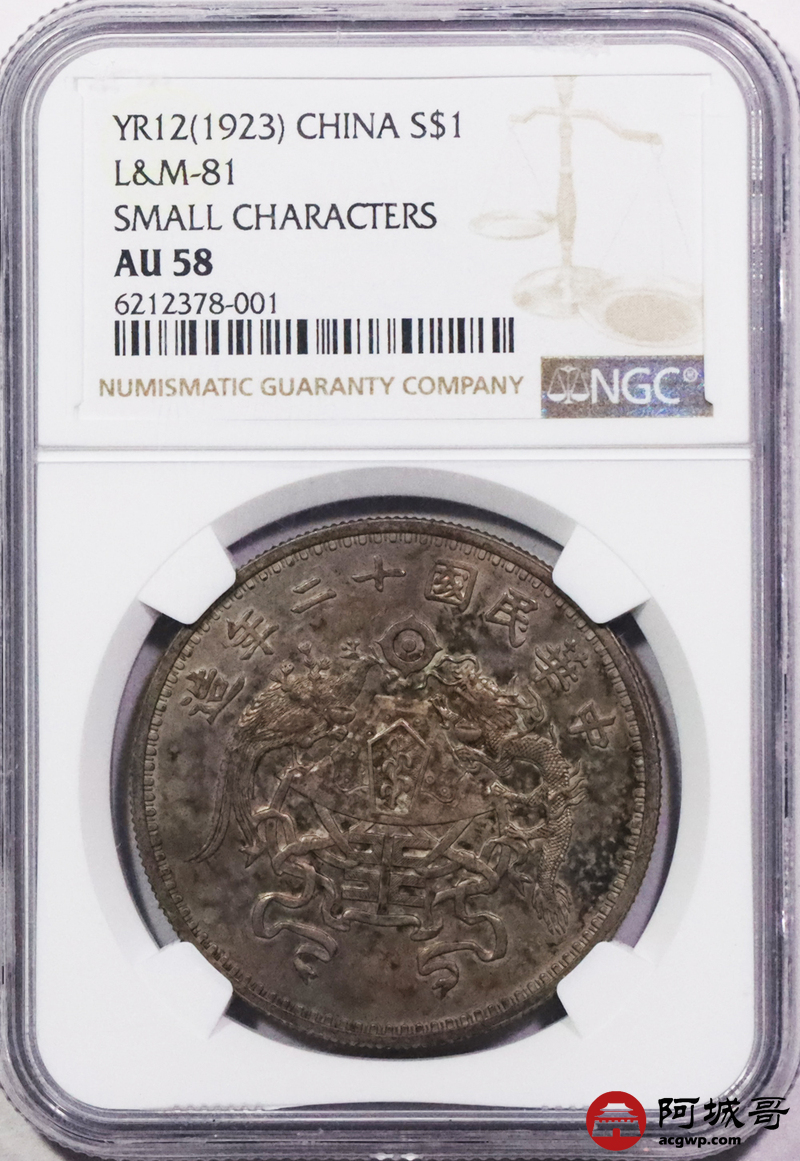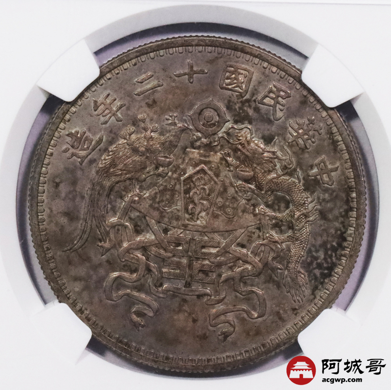 Lot:3168 1923民国十二年造龙凤壹圆银币一枚,小字版,铸打深俊,细节完美,咖啡色彩酱彩底板 NGC AU58评级编号:6212378-001