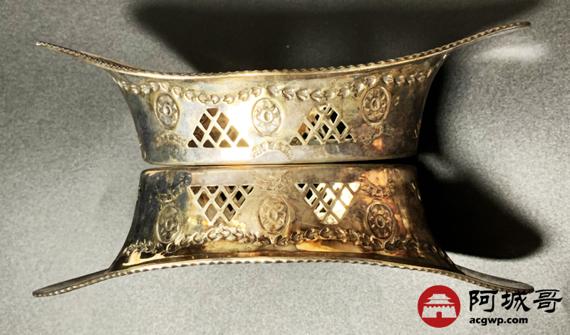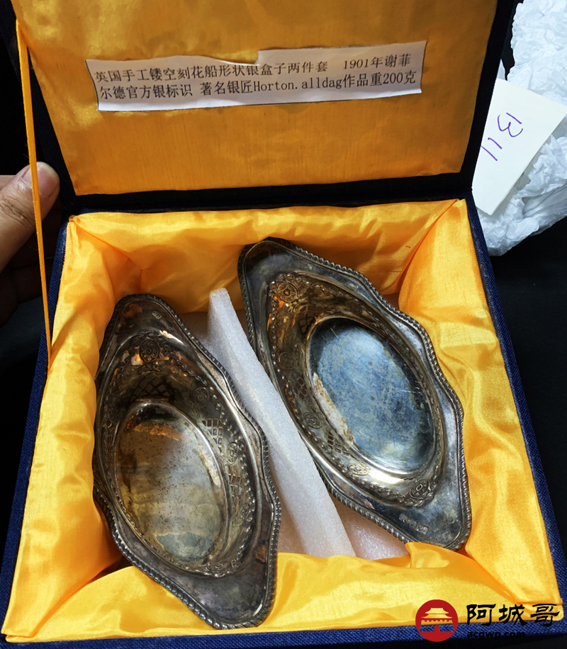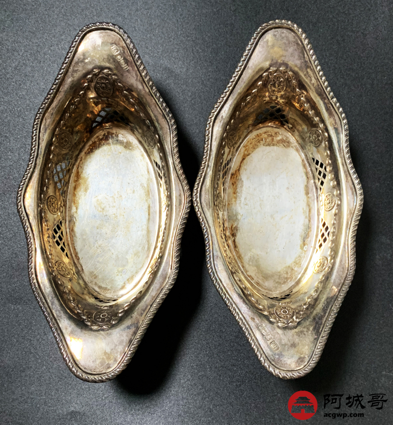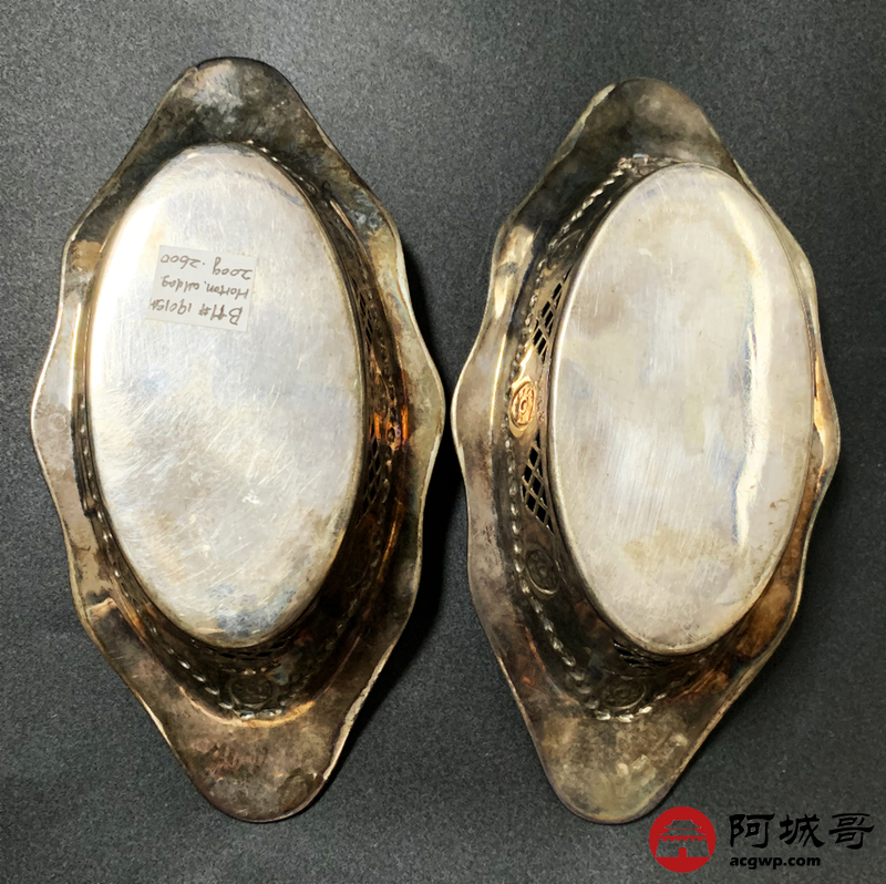 Lot:3823 英国手工镂空刻花船形凹盘一对,1901年谢菲尔德银标,著名银匠Horton.alldag标识,重200克