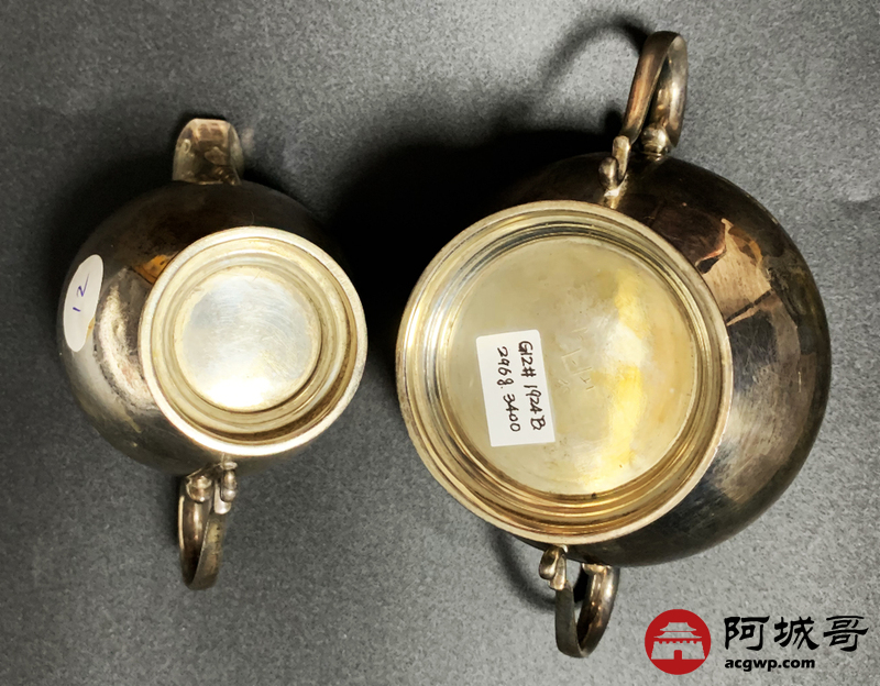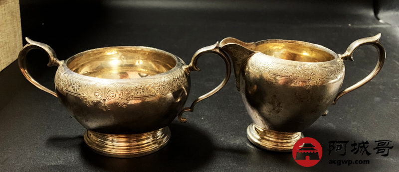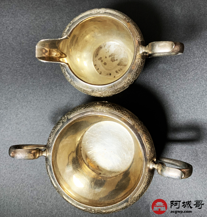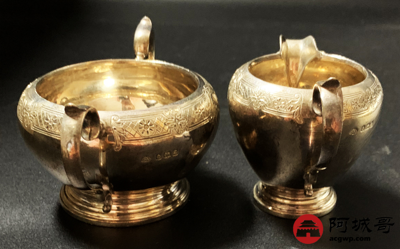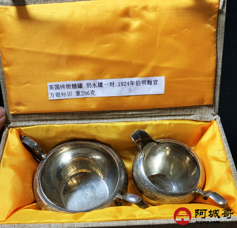 Lot:3850 英国纯银糖罐奶(茶)水罐一对1924年伯民翰官方银标识重296克