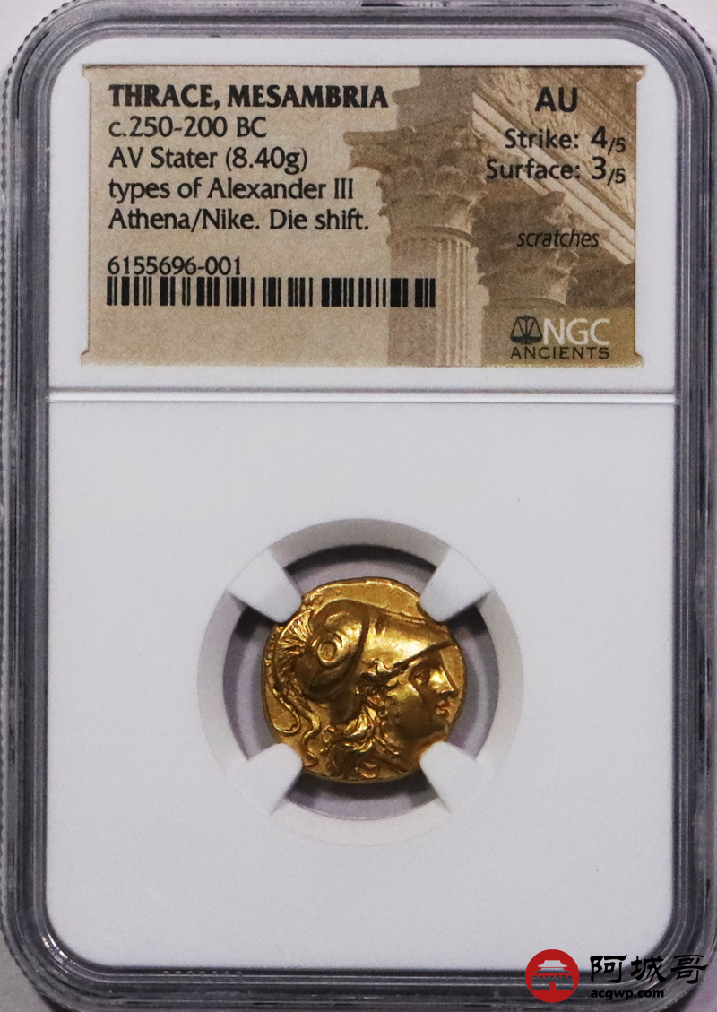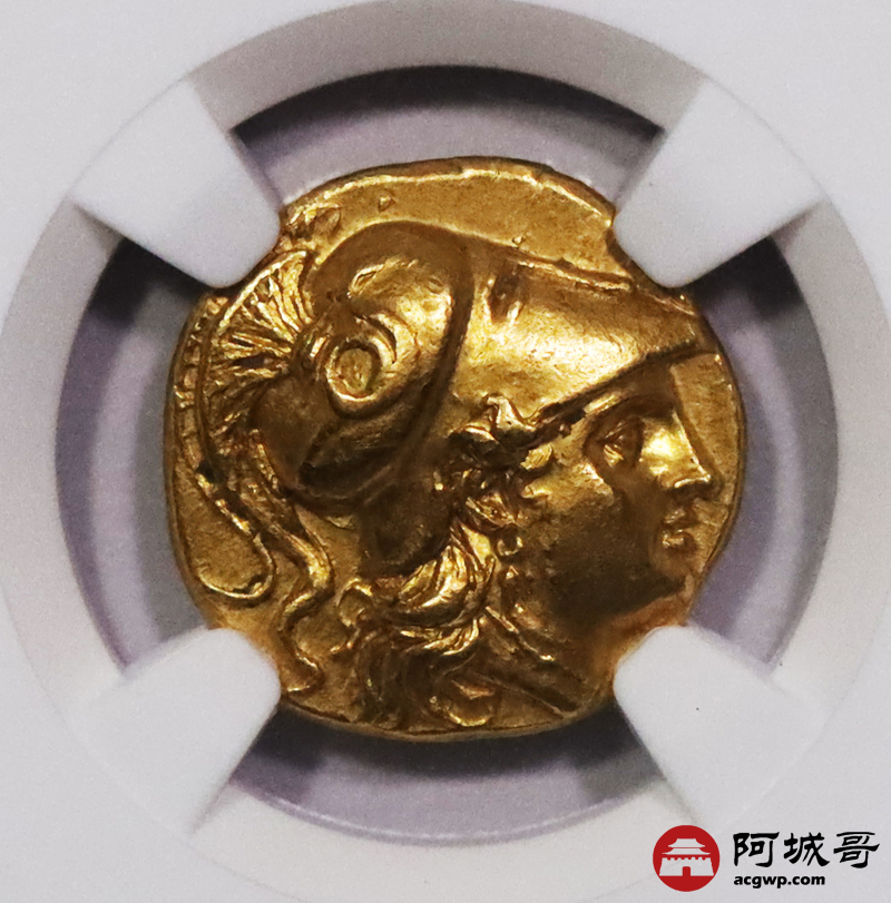 Lot:3656 古希腊色雷斯王国雅典娜与胜利女神金币 公元前250—前200年梅森布利亚发行 重量:8.4g 面值:1斯塔特金币 正面:雅典娜头像 反面:胜利女神手持花环 NGC AU评级编号:6155696-001