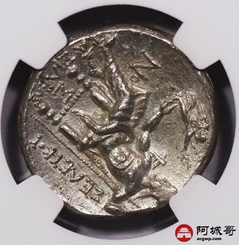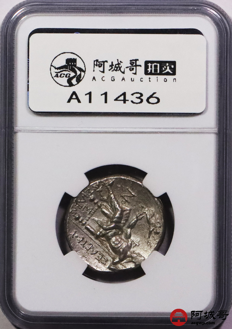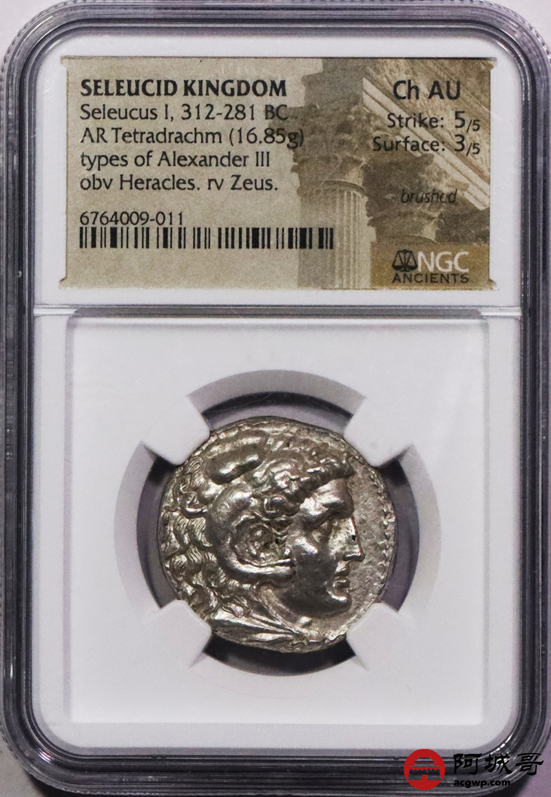 Lot:3709 古希腊塞琉古王国亚历山大大力神4德银币 公元前300—前280年发行 直径:26.1mm 重量:16.85g 面值:4德拉克马 正面:头戴狮皮盔的大力神赫拉克勒斯 反面:手托胜利女神持杖的宙斯坐像 NGC CH AU评级编号:6764009-011