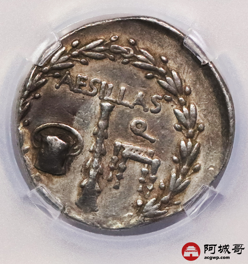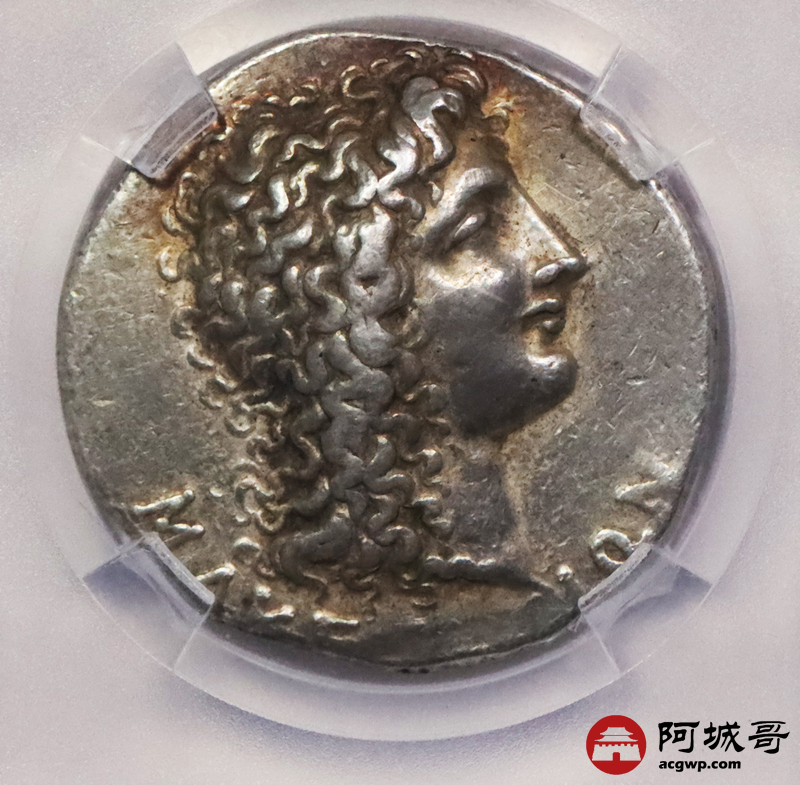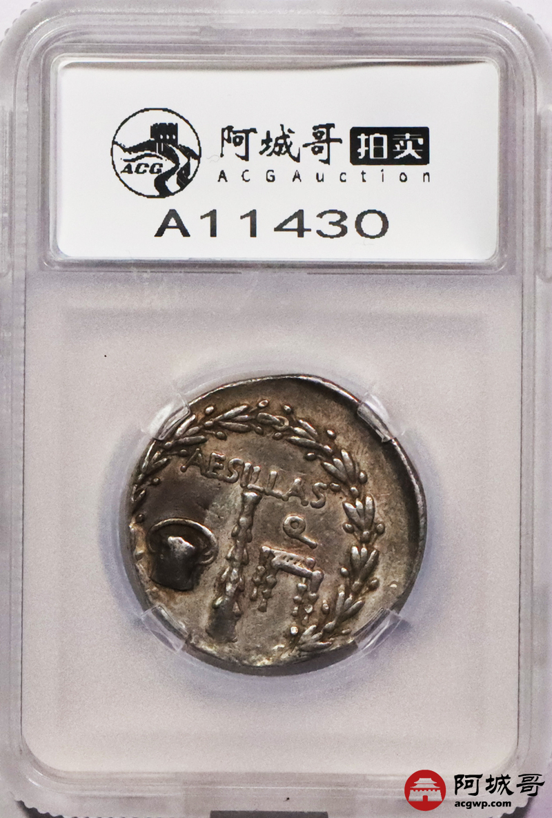 Lot:3706 古希腊马其顿卷发神化亚历山大帝4德银币 约公元前95—前70年发行(罗马统治马其顿时期) 直径:28mm左右 重量:16.77g 面值:4德拉克马 正面:神化的亚历山大大帝飘发头像,带有阿蒙的羊角 反面:花环内左下方为带盖的篮子(用以收集罗马各省税收),中为棍棒,右为座椅(古罗马时代的人们认为那是财务官履职时的专用座位),上方铭文为罗马财务官埃西拉斯的名字 TQG CH XF评级编号:1105020-003