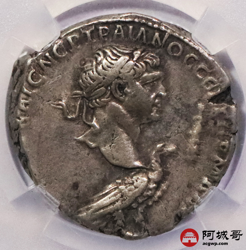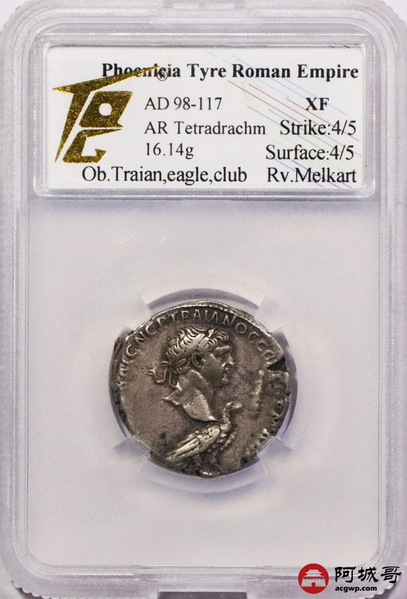 Lot:3720 古罗马塞琉西亚行省图拉真与大力神4德银币 公元98—117年佩里亚发行 重量:16.14g 面值:4德拉克马 正面:图拉真桂冠头像,底部有鹰和棒,环绕铭文 反面:大力神赫拉克勒斯头像TQG XF评级编号:1100667-014