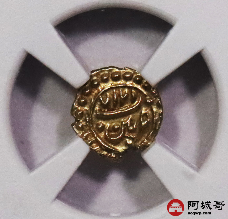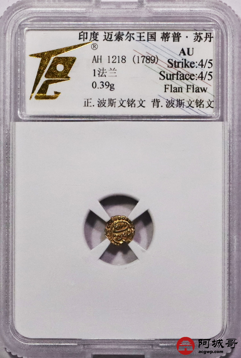 Lot:3704 印度迈索尔1法兰金币 公元1789年蒂普·苏丹发行 重量:0.39g 面值:1法兰 正面:波斯文铭文 反面:波斯文铭文 TQG AU评级编号:1105039-012