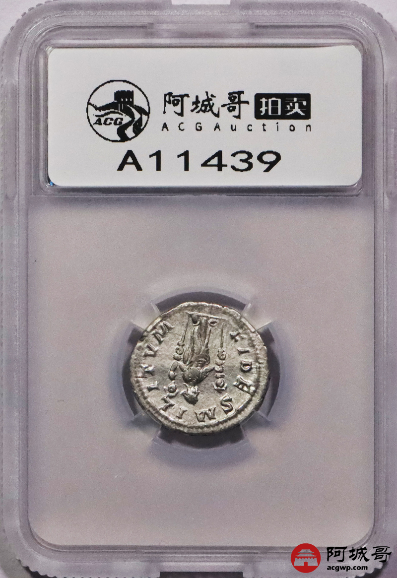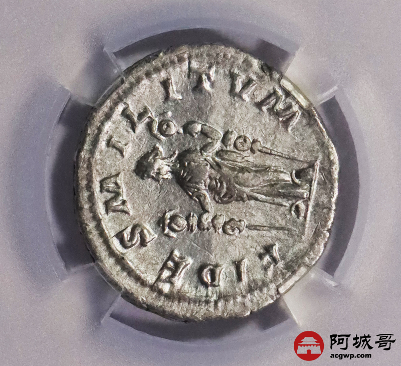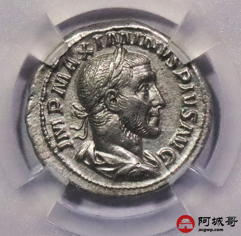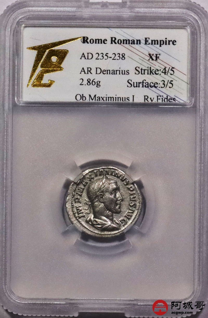 Lot:3723 古罗马帝国时期马克西米努斯1第纳里银币 公元235—238年发行 重量:2.86g 面值:1第纳里 正面:头戴桂冠的君主马克西米努斯面右头像 反面:信义女神菲德斯站像 TQG XF评级编号:1100680-002