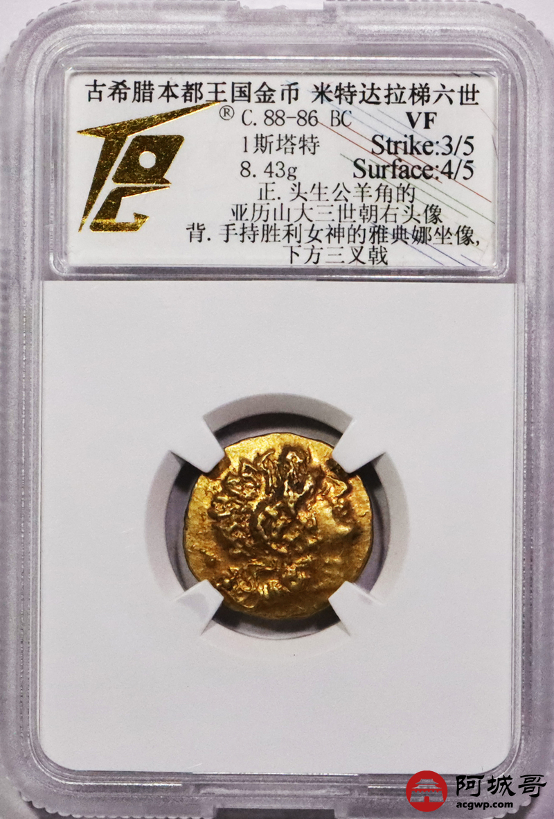 Lot:3655 古希腊本都王国羊角亚历山大与雅典娜金币 公元前88—前86年发行 直径:19.8mm 重量:8.43g 面值:1斯塔特金币 正面:头生羊角的亚历山大大帝头像 反面:手托胜利女神的雅典娜坐像 TQG VF评级编号:1105366-006