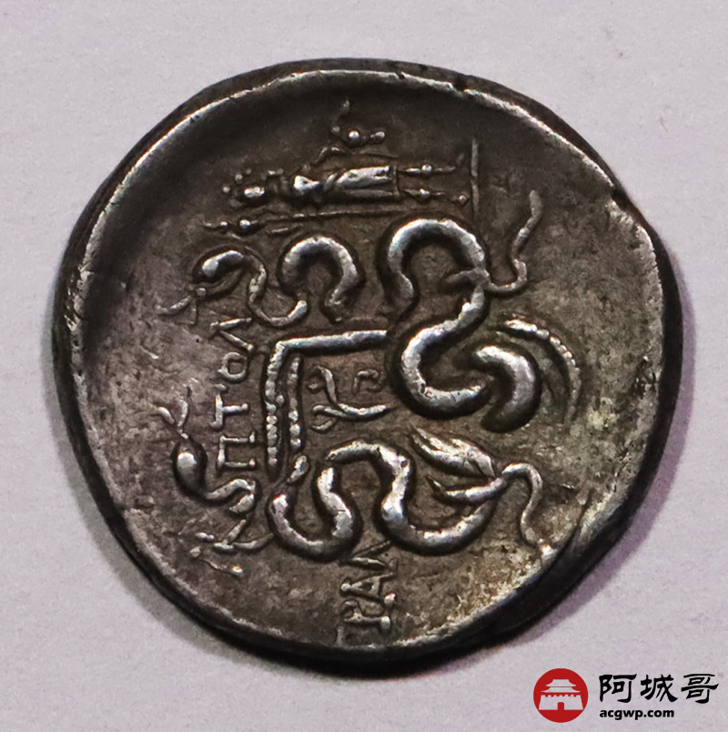 Lot:3787 古希腊吕底亚蛇篮4德银币一枚, 公元前133年左右发行 直径:25.9mm 重量:12.27g 面值:4德拉克马 正面:蛇由祭篮内探出,由藤叶枝环绕 反面:两蛇盘绕箭袋,右侧为月亮女神阿尔忒尼斯的崇拜雕像,左边地名TRAΛ