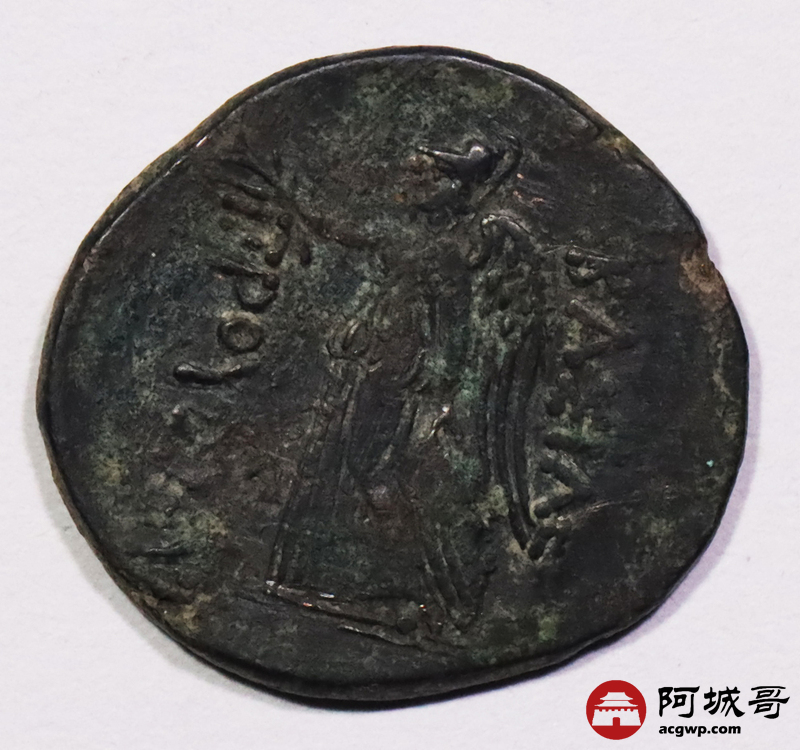 Lot:3788 古希腊比提尼亚王国阿波罗与胜利女神铜币一枚 公元前238—前183年发行 直径:28mm 重量:9.27g 正面:戴月桂冠的太阳神阿波罗面左头像,头像内有女神头像戳记 反面:胜利女神Nike手持橄榄枝站像