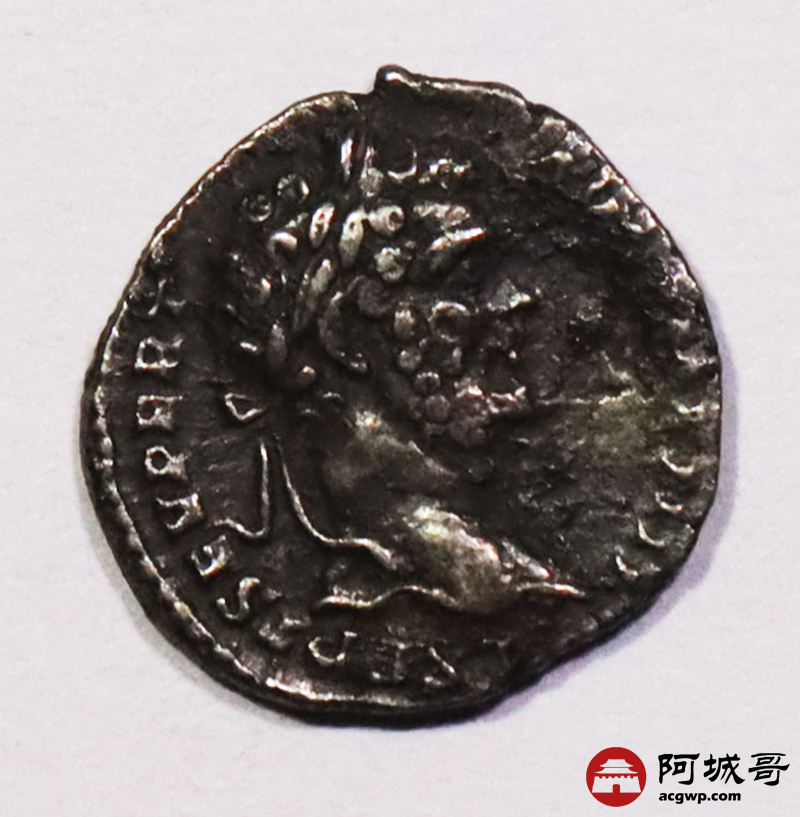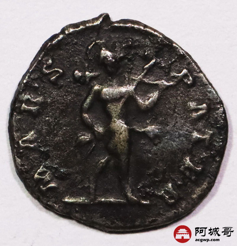 Lot:3791 古罗马帝国时期西亚历山大·塞维鲁1第纳里银币一枚, 公元193—211年发行 直径:18 mm 重量:2,76 g 面值:1第纳里 正面:头戴桂冠的亚历山大塞维鲁 反面:战神马尔斯扛着战利品架