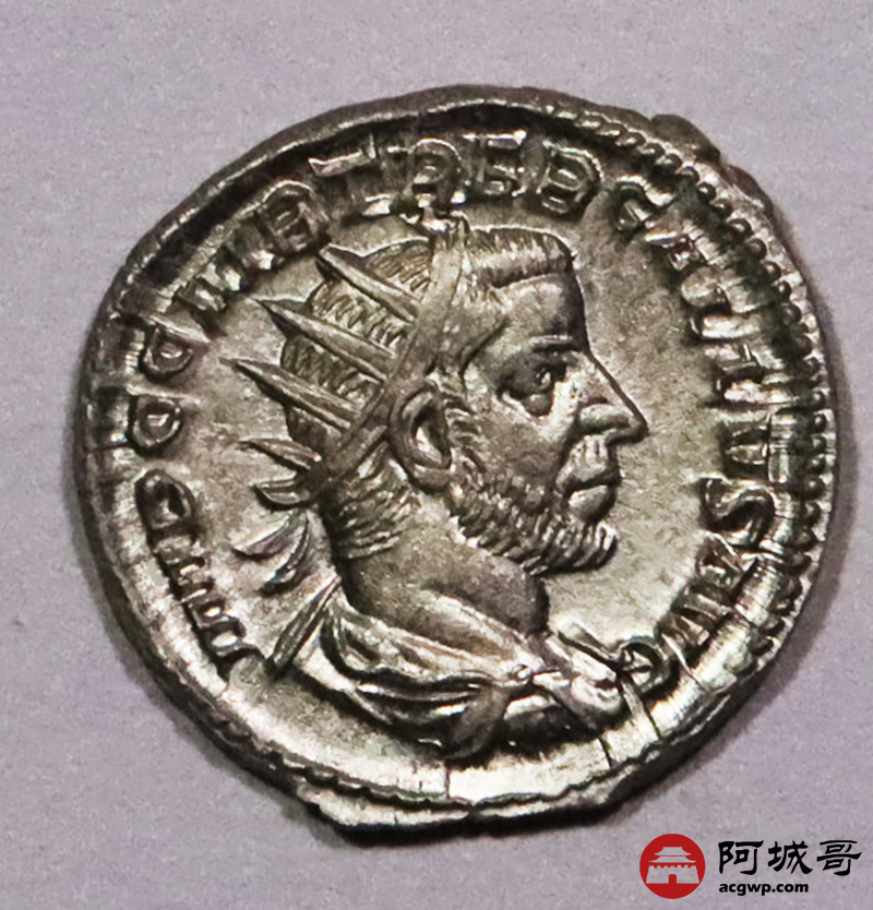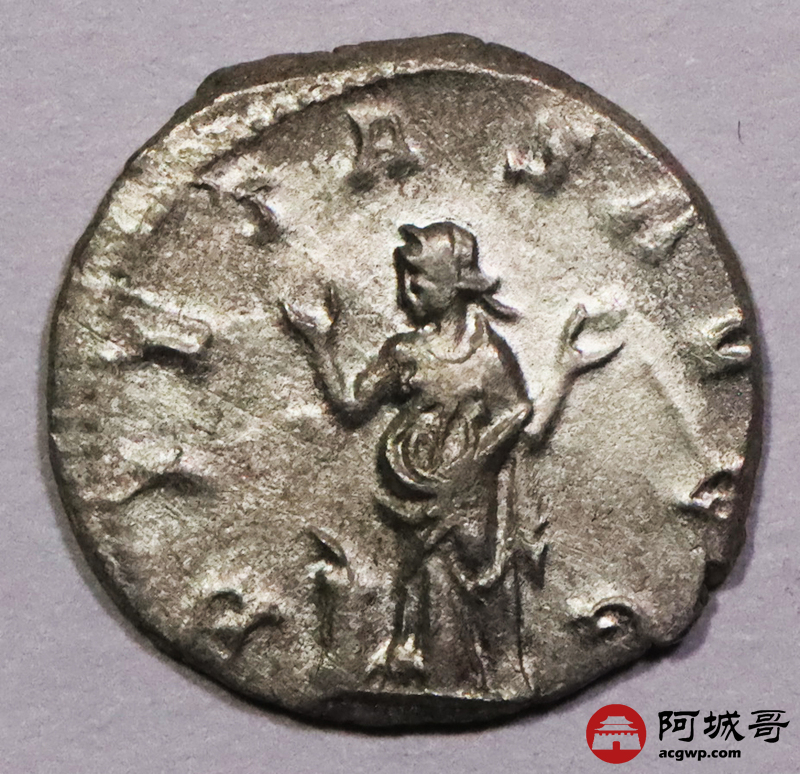 Lot:3789 古罗马帝国加卢斯1第纳里银币一枚, 公元251年—253年发行 直径:20.5mm 重量:3.27g 面值:1第纳里 正面:头戴太阳芒冠的皇帝加卢斯头像 反面:虔敬女神皮塔斯站像