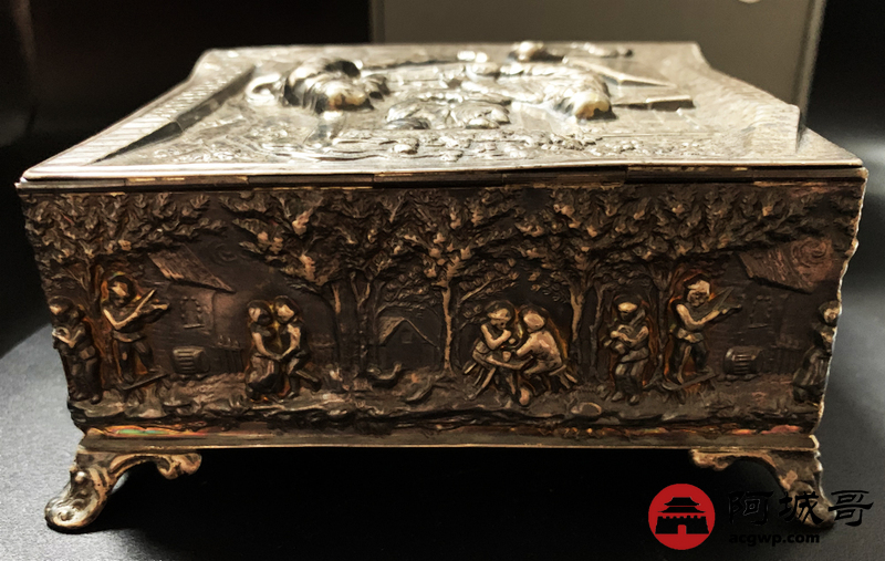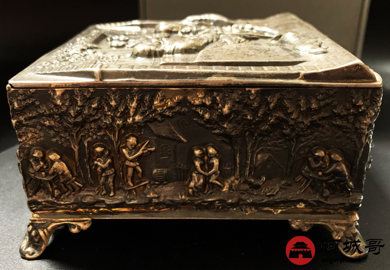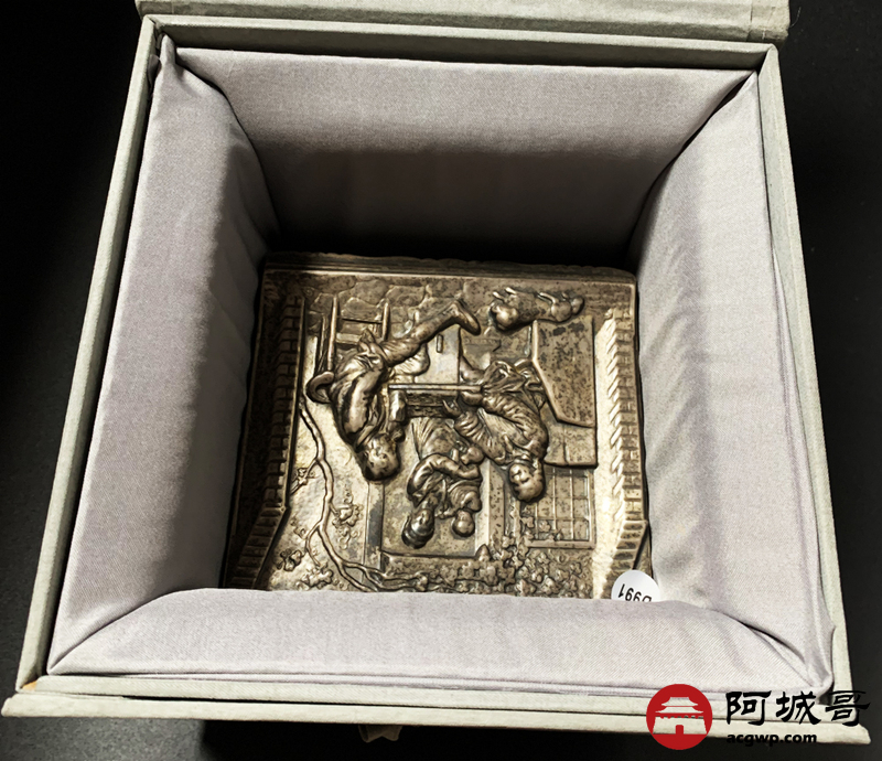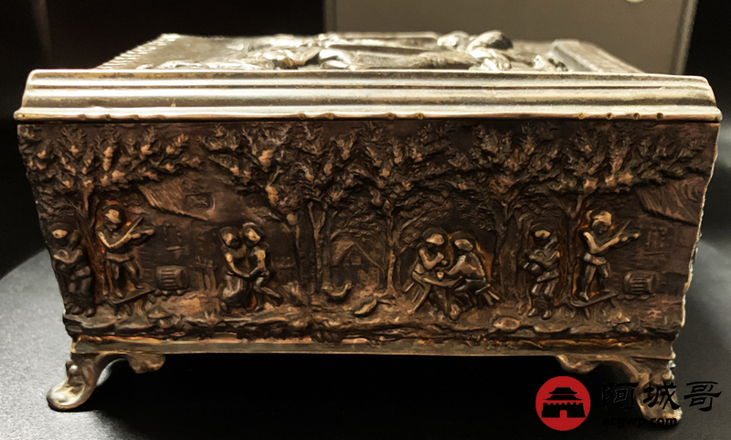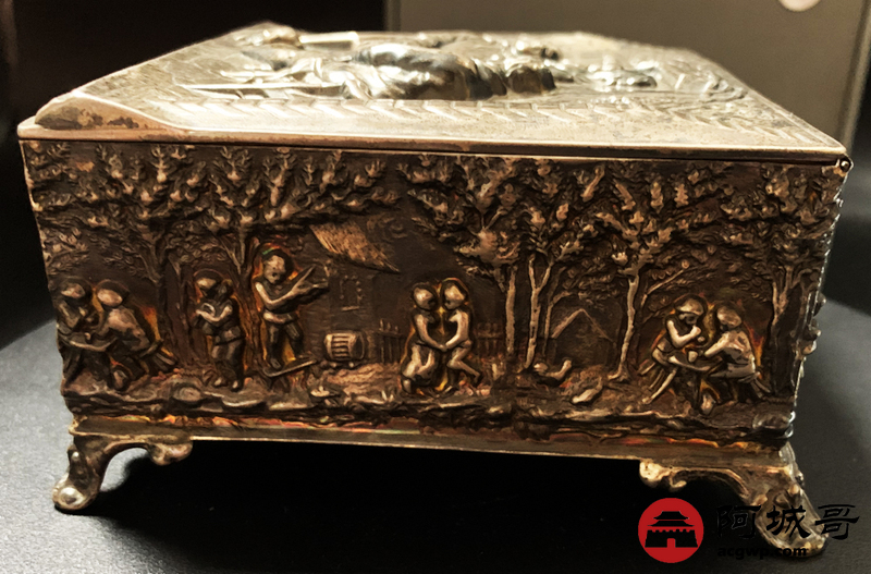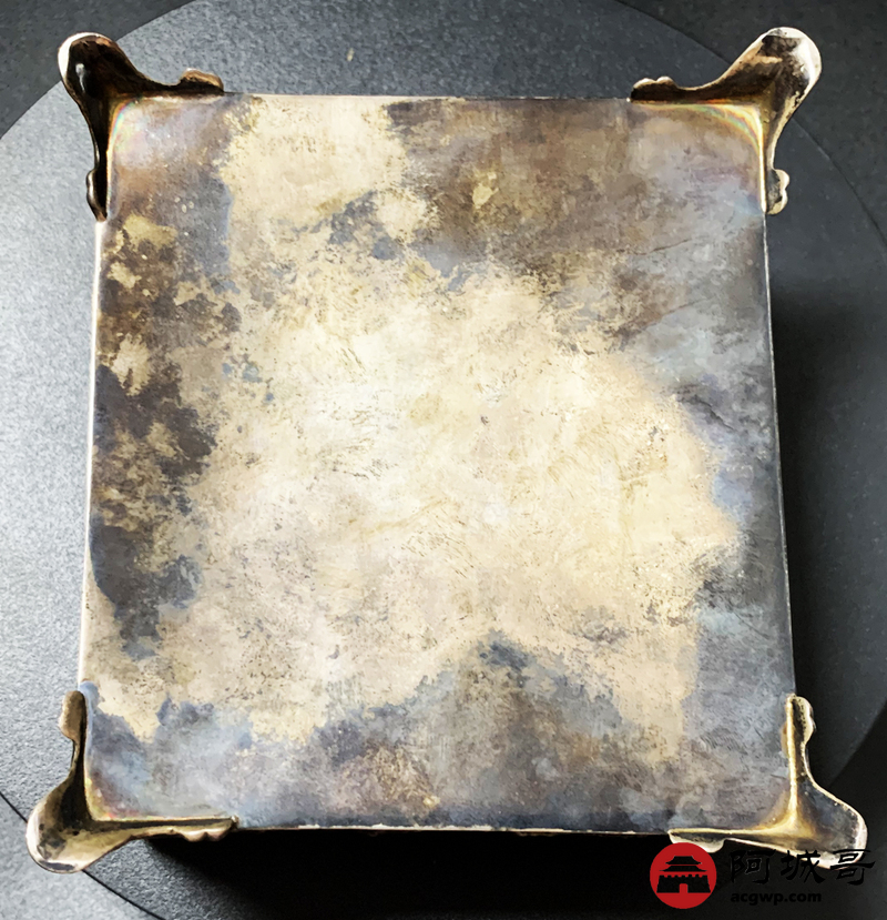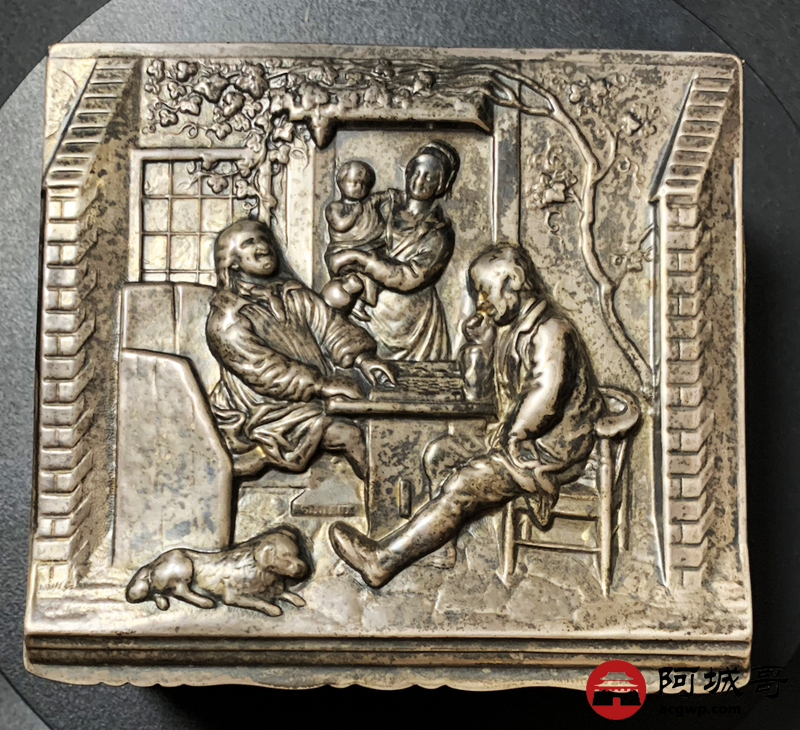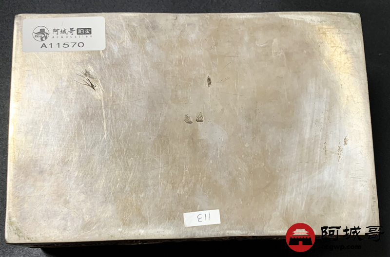 Lot:3830 18世纪英国雪茄银盒一件,长:122毫米,宽:112毫米,重量:297.8克,烟盒外壁打磨光亮,盒面采用锤揲、鏨刻、焊贴等工艺制成,包浆自然,保存完好