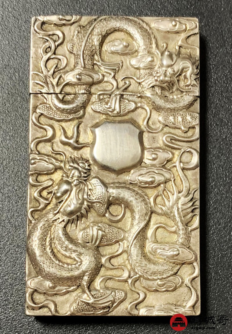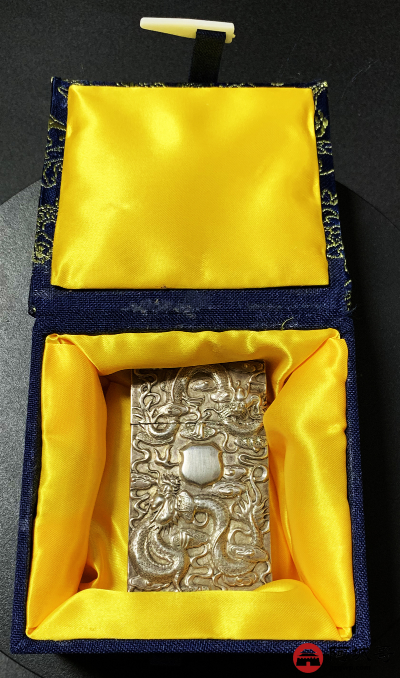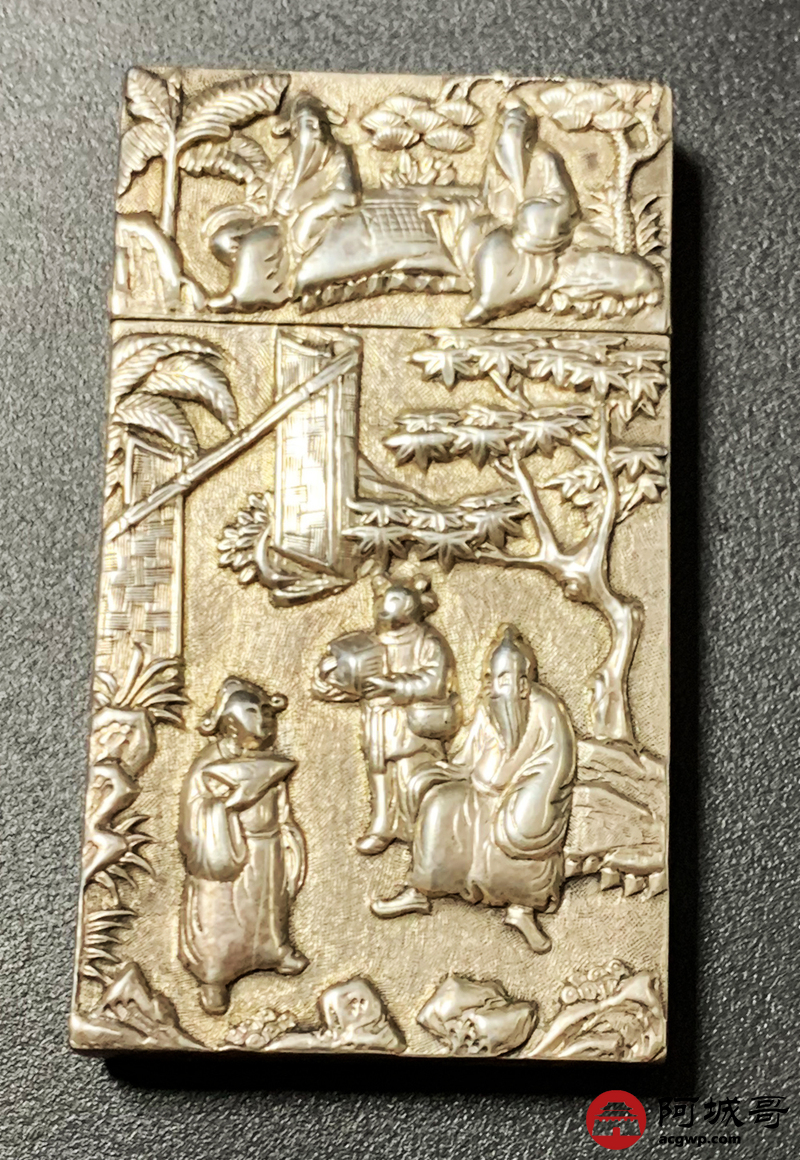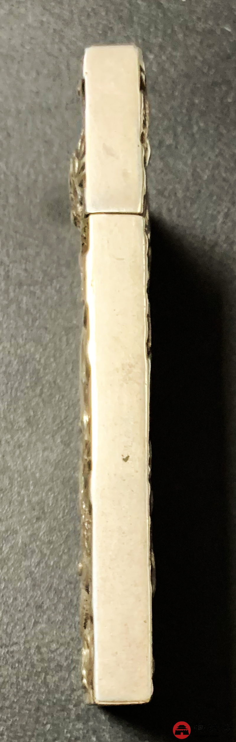 Lot:3831 清代十三行精致人物牙签盒一件,长:80毫米,宽:45毫米,重量:50.2克,牙签盒采用锤揲、焊贴等工艺制成,面饰云纹龙图,蛟龙昂首摆尾,体态刚劲,另面古树繁花,刻划入微,立体感极强,隙地施细密鱼子纹,制作技艺精湛,集观赏与实用价值于一身,十分难得