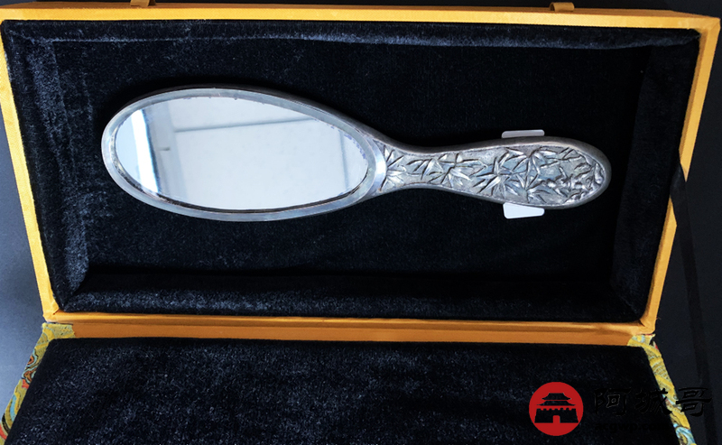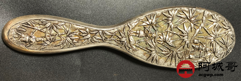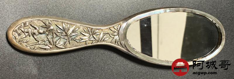 Lot:3844 清代人物银手柄镜子一把,渔樵耕读 高24.5CM 重236.1克