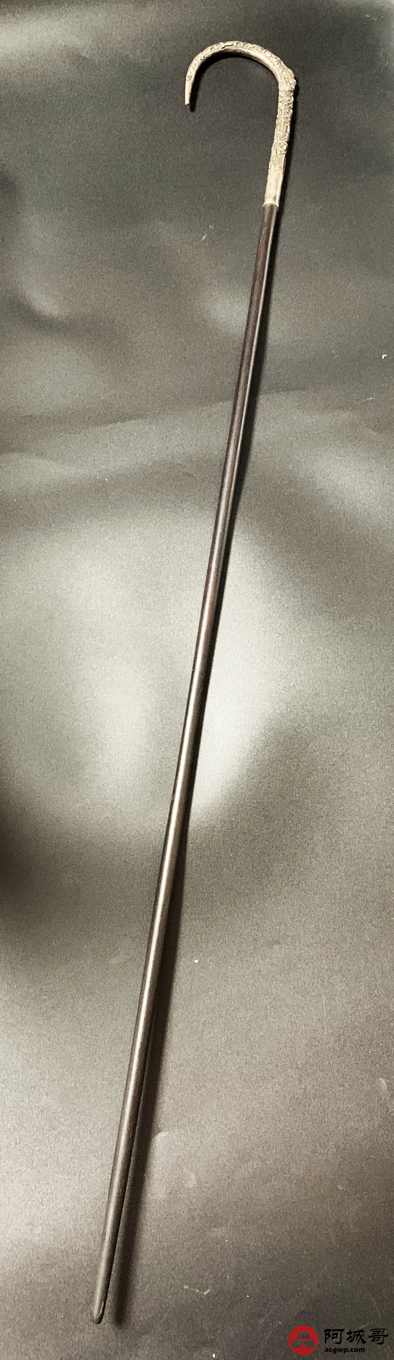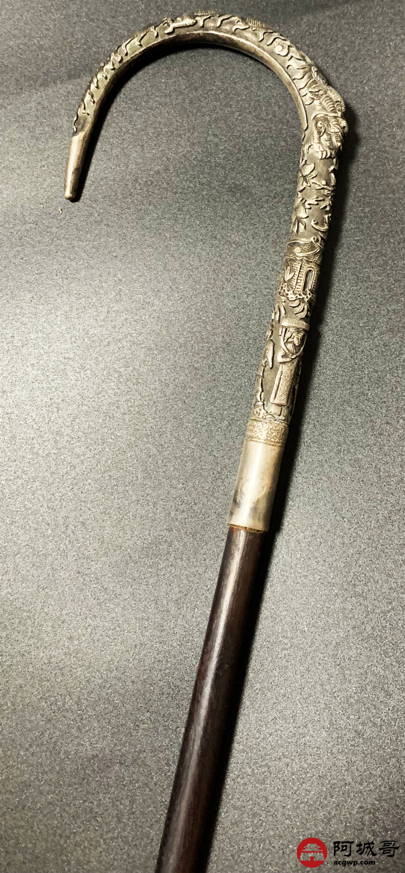 Lot:3836 清代弯把龙纹人物图文明仗一件,长:977毫米,重量:128.6克,仗首及杆上部包裹高浮雕龙纹人物图银饰;仗首弯头光素,手握舒适,仗首下方则浮雕单纹龙,蛟龙肆意游弋,鳞片层叠,锋芒毕露,人物神态各异,惟妙惟肖,手杖仗体为酸枝木质,笔直坚硬,银饰部分雕刻技艺精湛,画面丰富,西式文明仗加入中式纹样,充分体现中西文化之融合,保存良好
