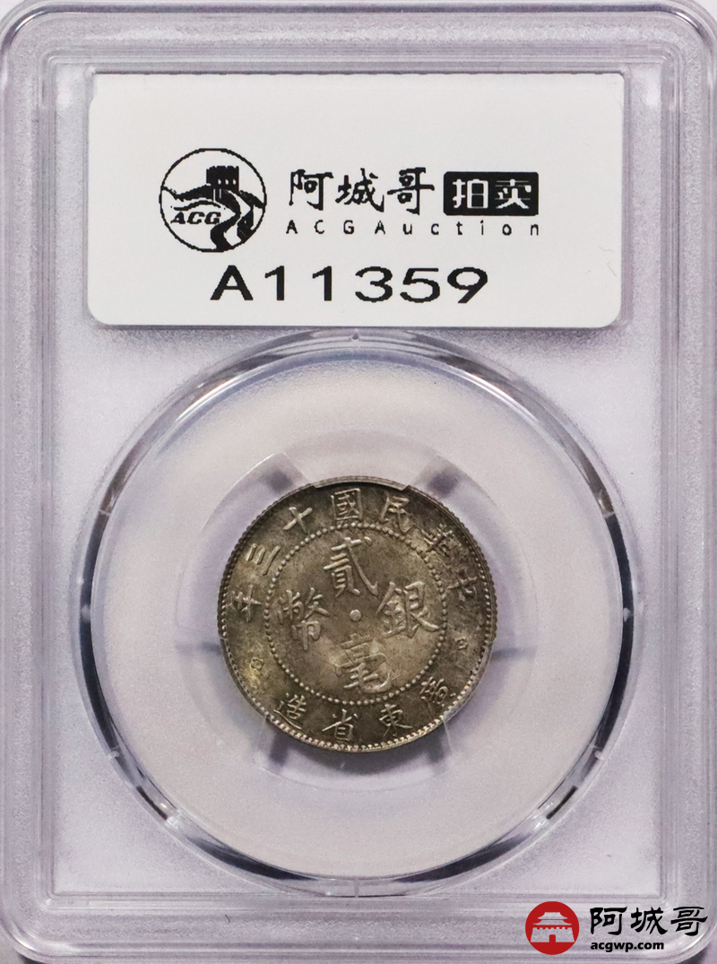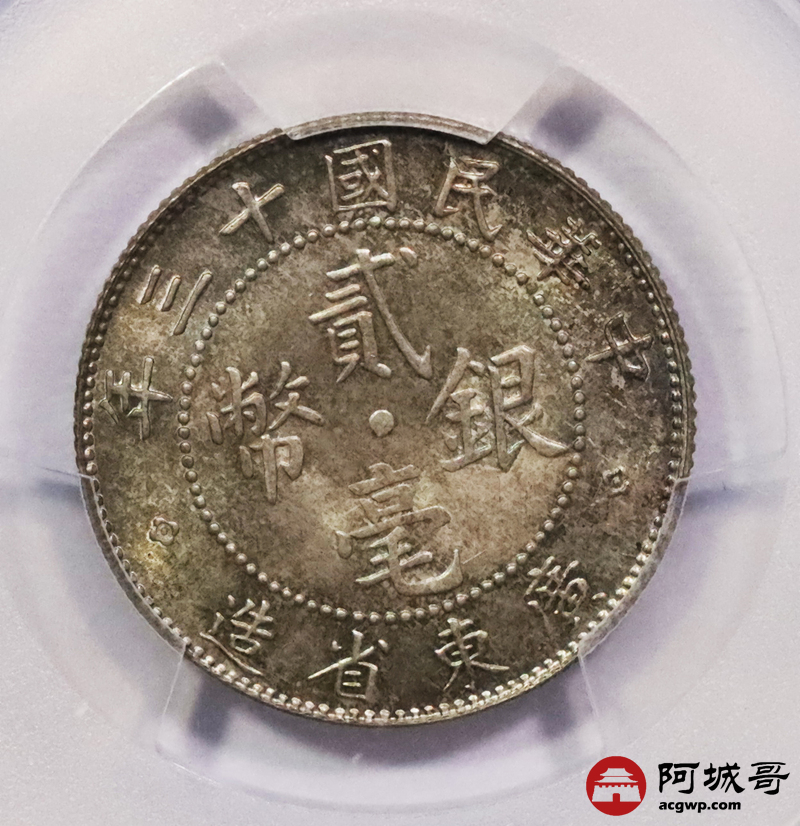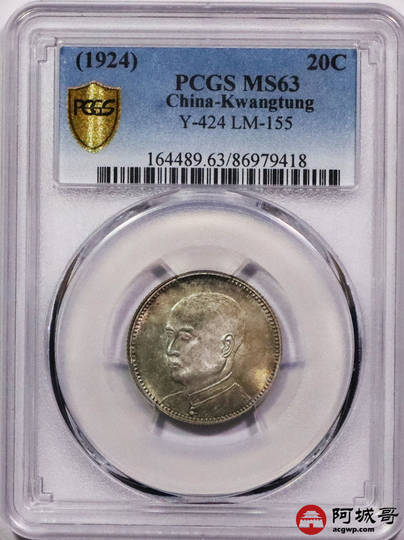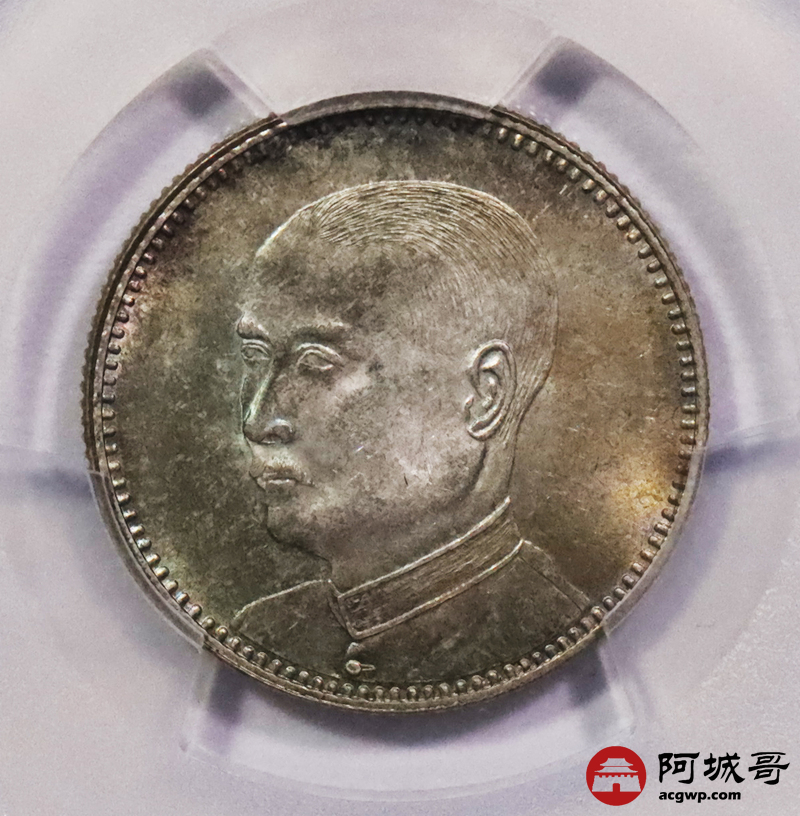 Lot:3616 1924民国十三年广东省造孙中山像二豪银币一枚,五彩包浆深打PCGS MS63评级编号:86979418