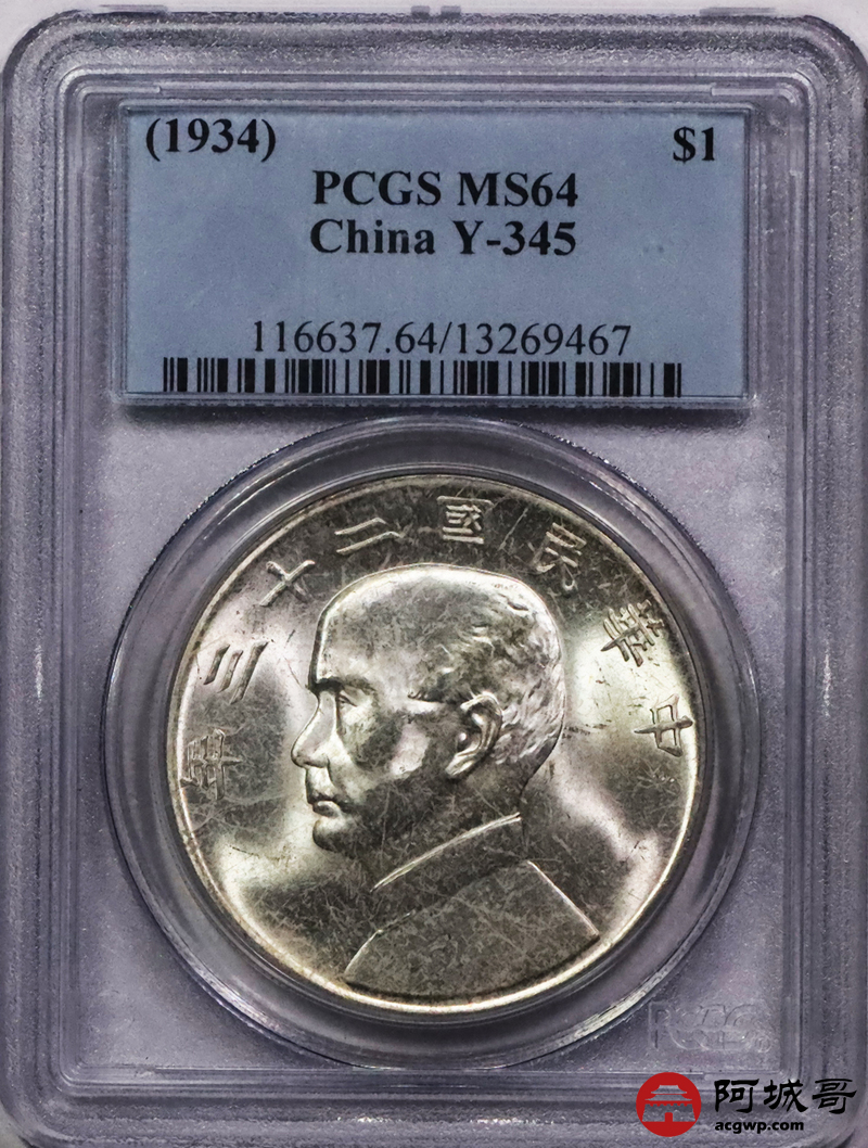 Lot:3561 1934民国二十三年孙中山像背帆船壹圆银币一枚,原色曝光 PCGS MS64评级编号:13269467
