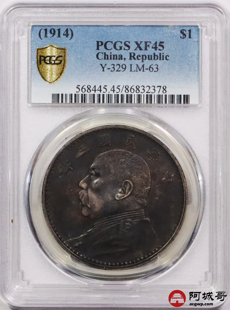 Lot:3501 1914民国三年袁世凯像壹圆银币一枚,酱彩包浆PCGS XF45评级编号:86832378
