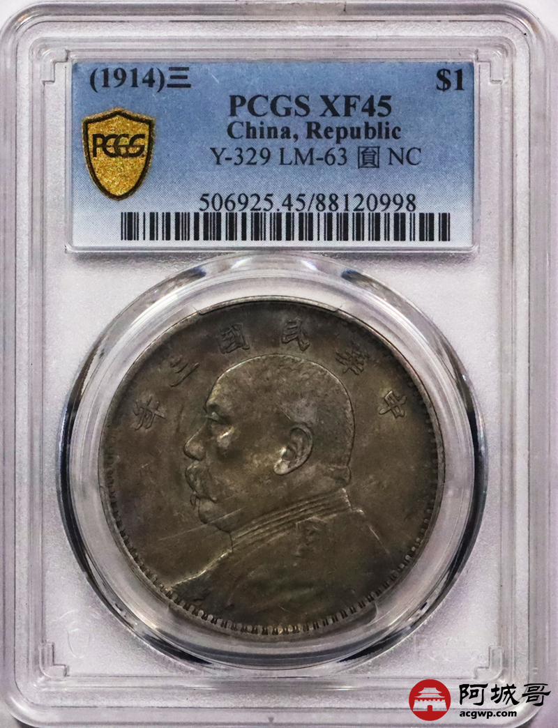 Lot:3500 1914民国三年袁世凯像壹圆银币一枚,酱彩老包浆PCGS XF45评级编号:88120998