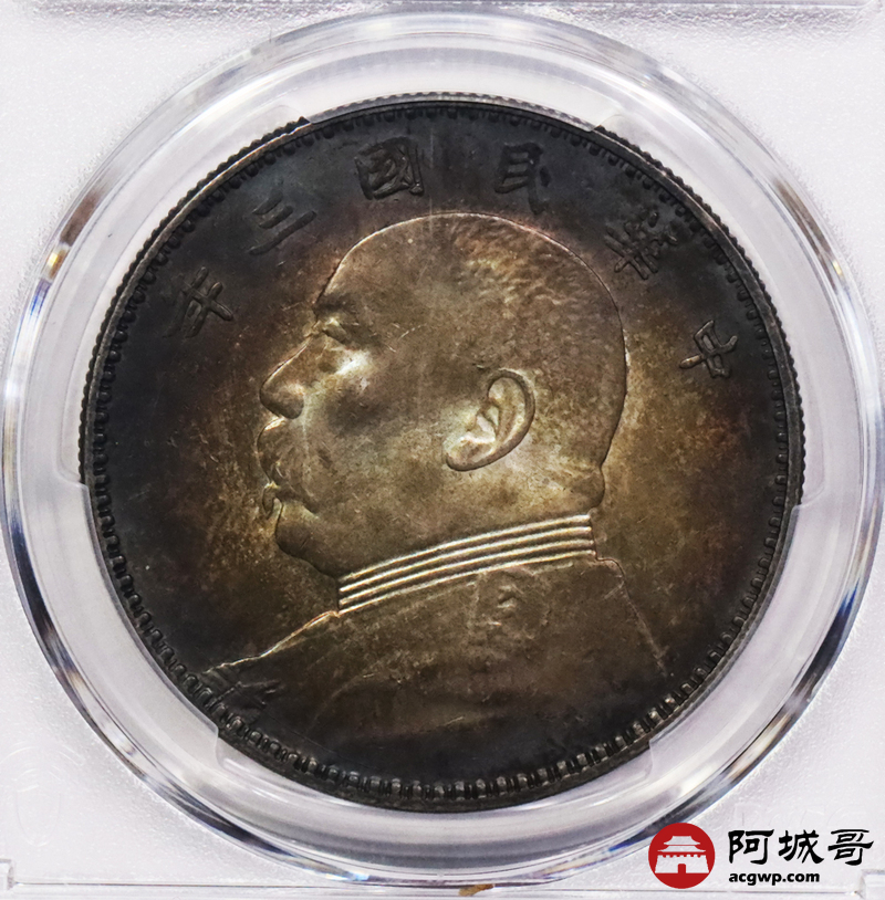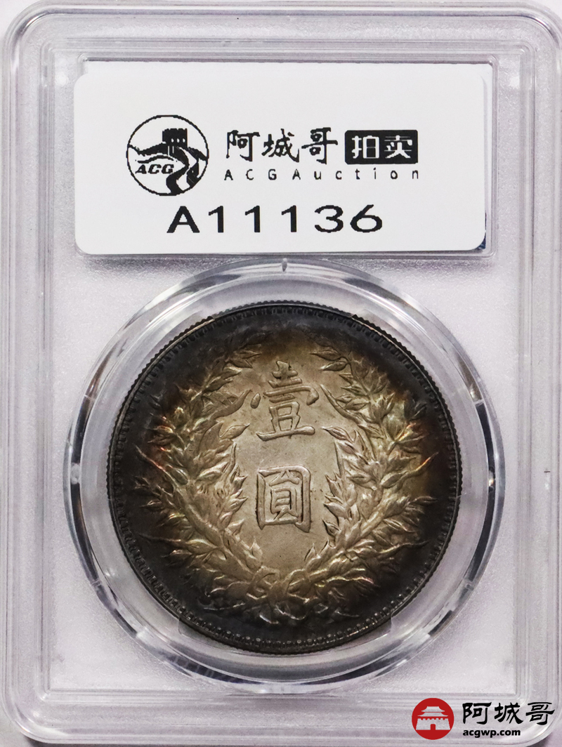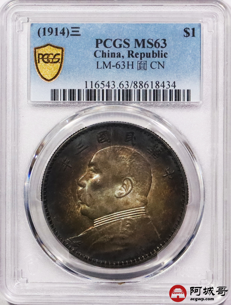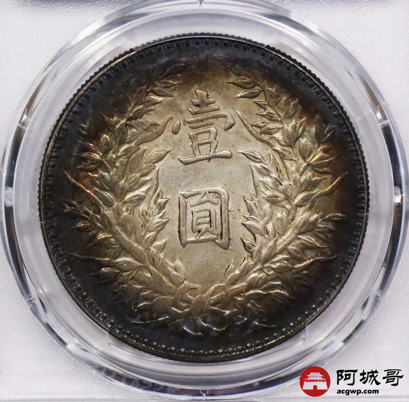 Lot:3482 1914民国三年袁世凯像壹圆银币一枚,酱红环五彩包浆 PCGS MS63 评级编号:88618434