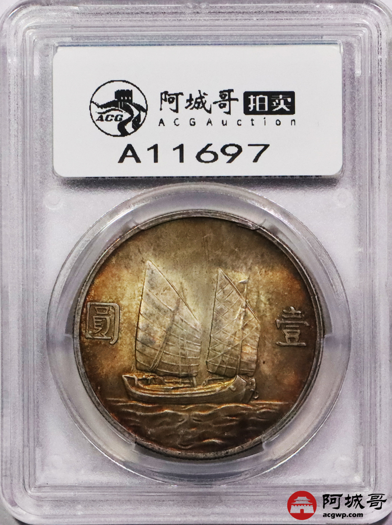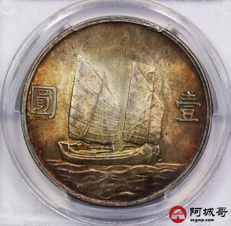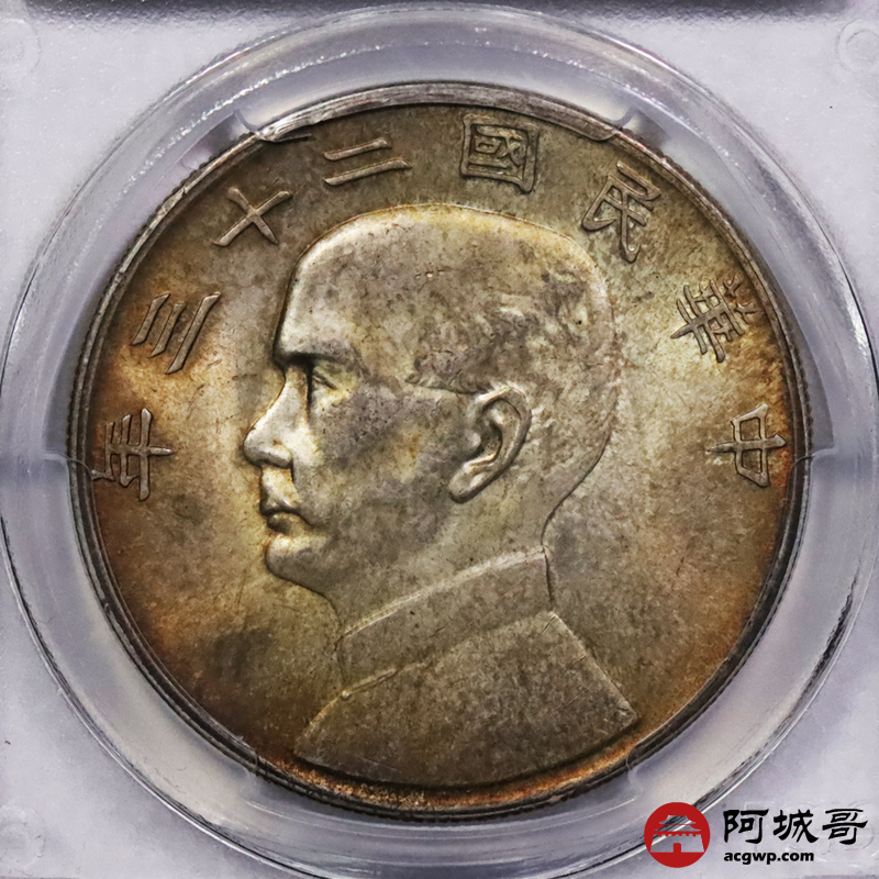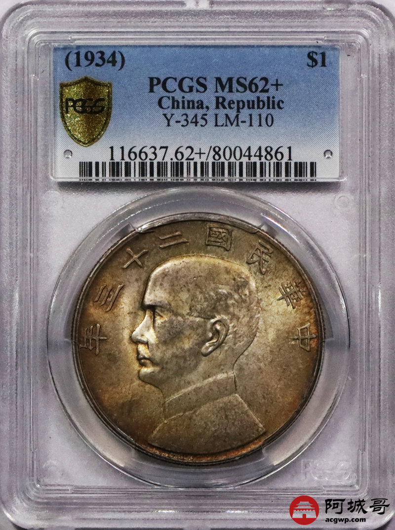 Lot:3567 1934民国二十三年孙中山像壹圆银币一枚,黄油五彩底板 PCGS MS62+ 评级编号:80044861