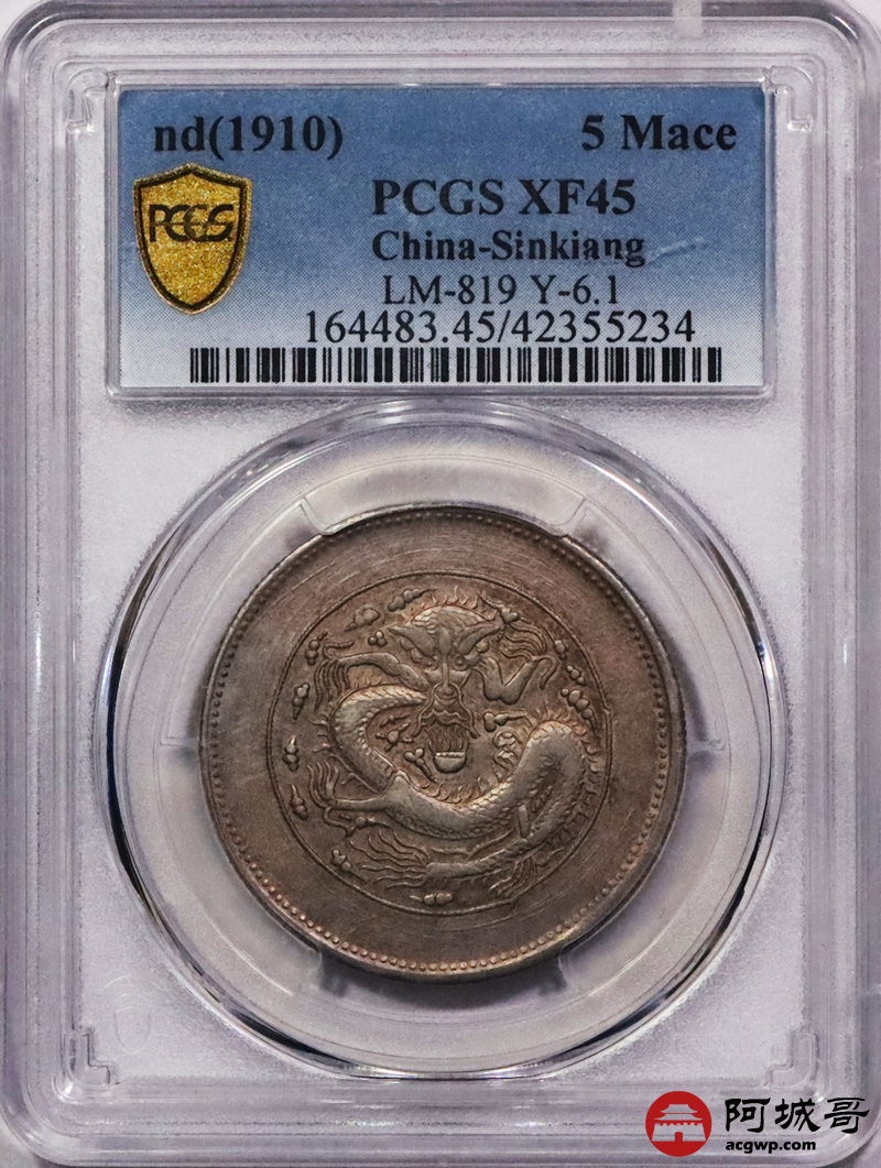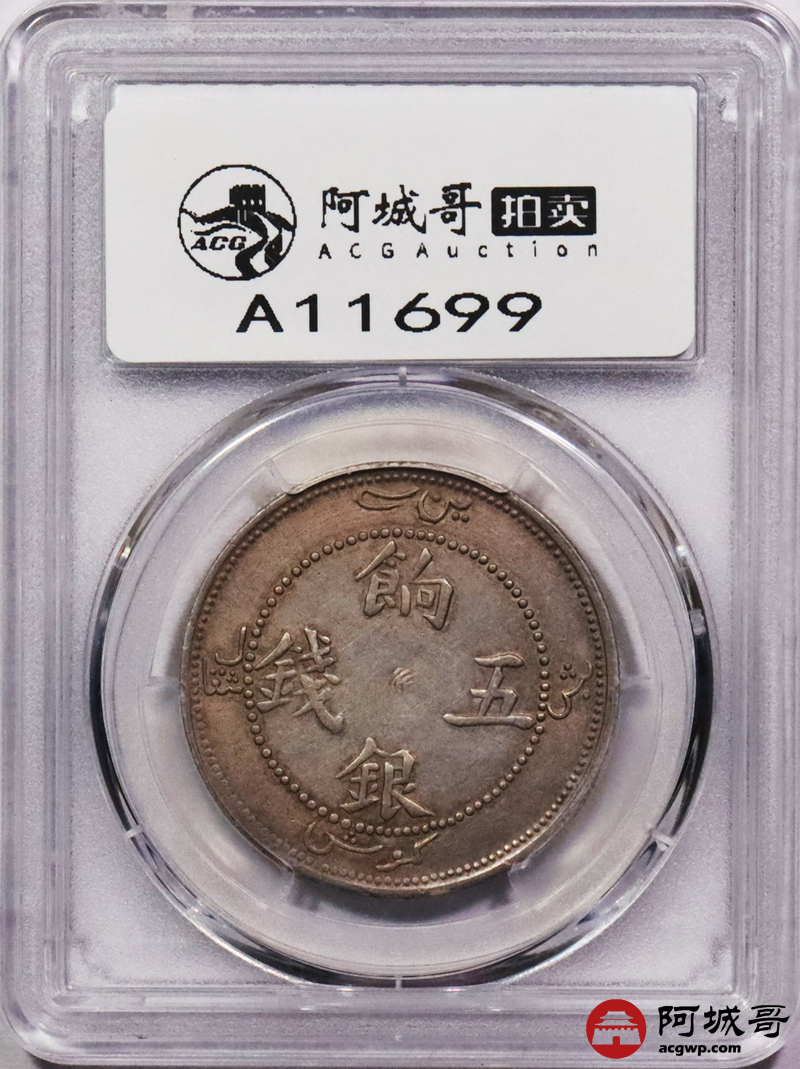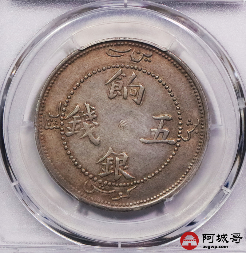 Lot:3448 1910新疆饷银伍钱银币一枚,猫爪暗记,粉彩底板 PCGS XF45 评级编号:42355234