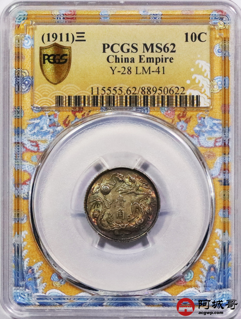 Lot:3091 1911宣统三年大清壹角银币一枚,深打老五彩 ,细节完美 PCGS MS62 评级编号:88950622