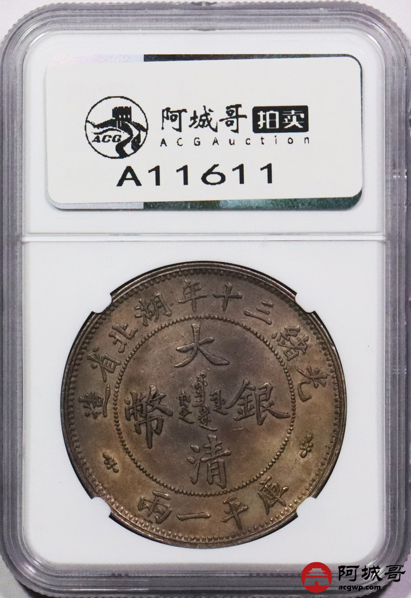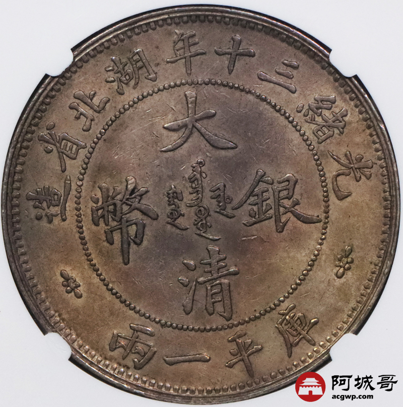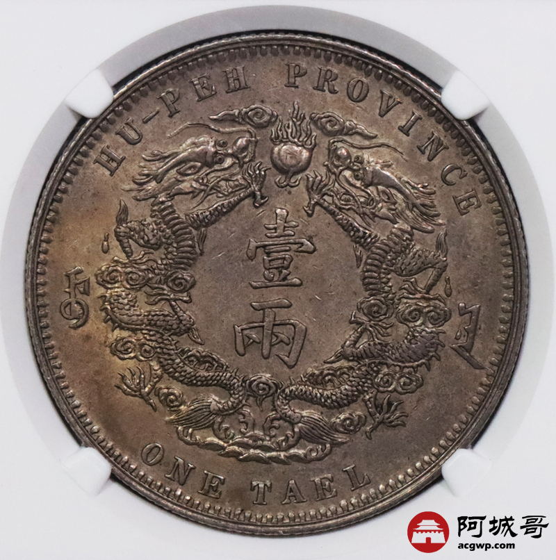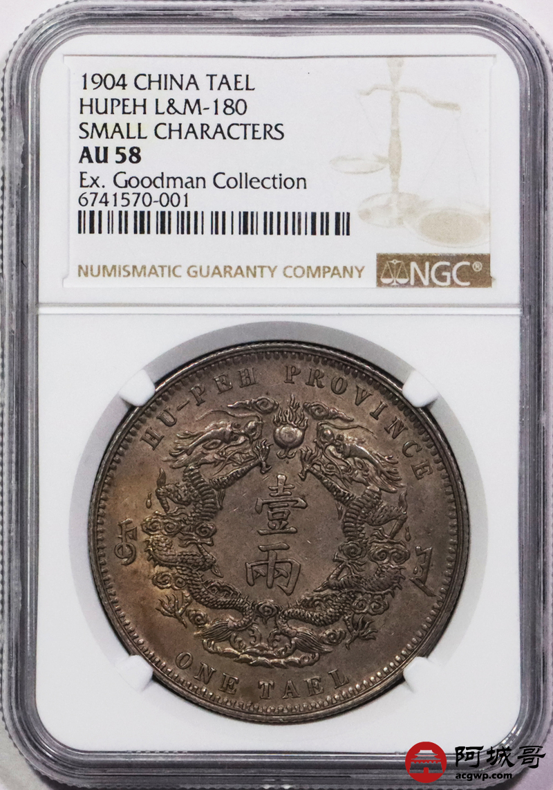 Lot:3084 1904光绪三十年湖北省造大清银币双龙一两银币一枚,小字版,字口铸打锐利,龙鳞饱满颗颗可数,双面底板匀称古铜色酱味包浆,味道十足,古德曼旧藏 NGC AU58 评级编号:6741570-001