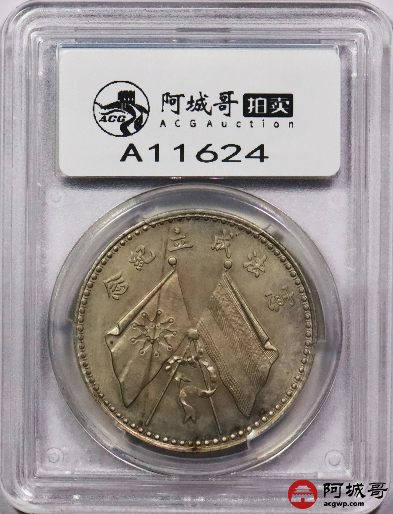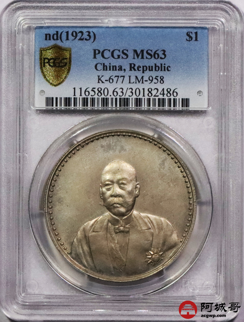 Lot:3159 1923年文装曹锟纪念壹圆银币一枚,铸模极深,边阔高耸,圆珠内齿颗粒饱满,须发文饰精细入微,正反黄油底板,状态一流,品相出众 PCGS MS63评级编号:30182486