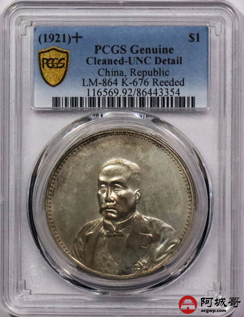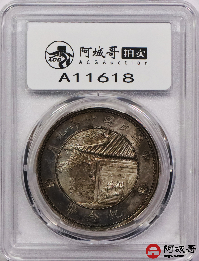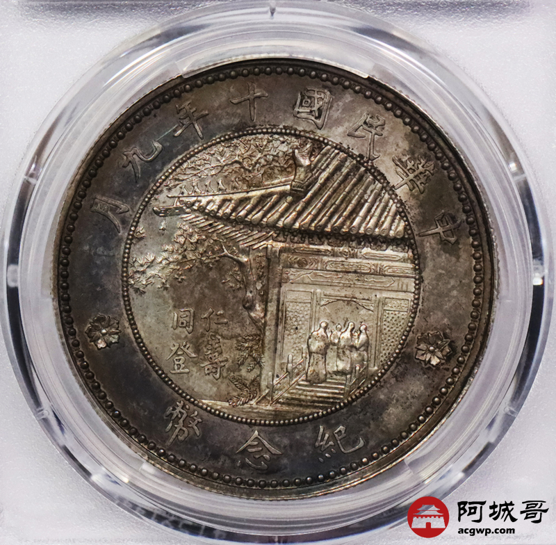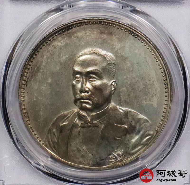 Lot:3157 1921民国十年九月徐世昌像仁寿同登纪念壹圆银币一枚,黄油底板全深打,卷尾五彩 PCGS UNC