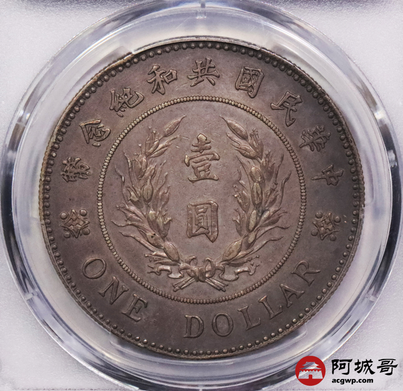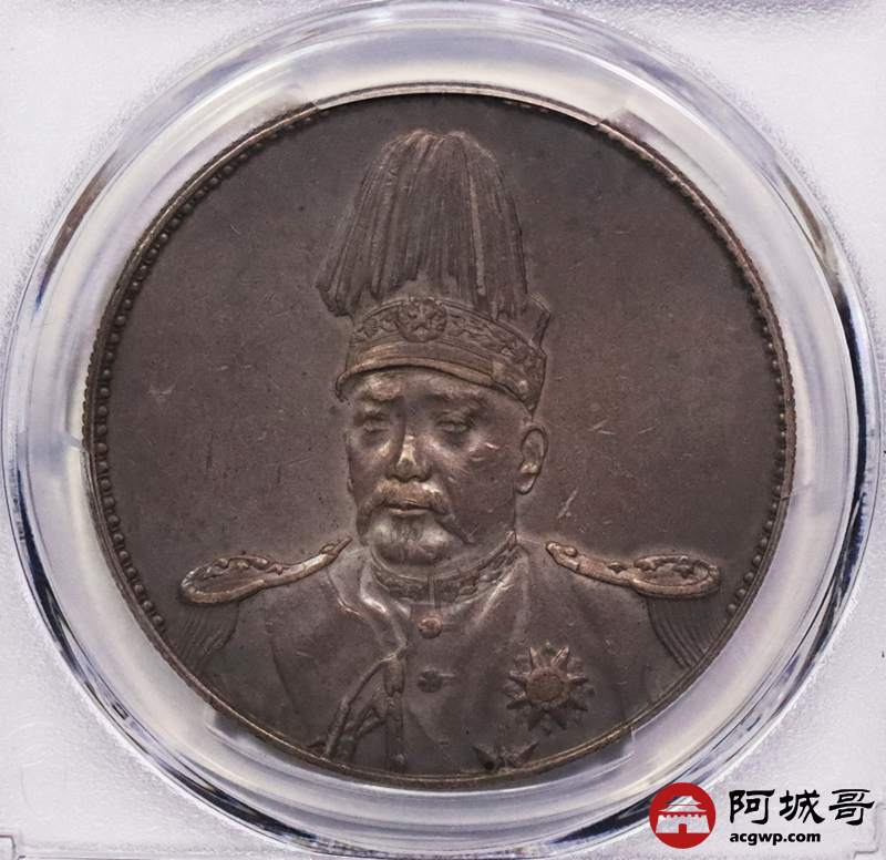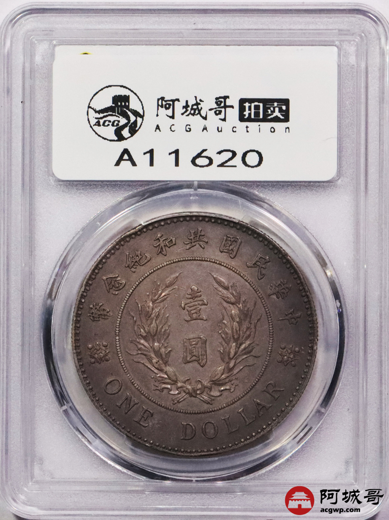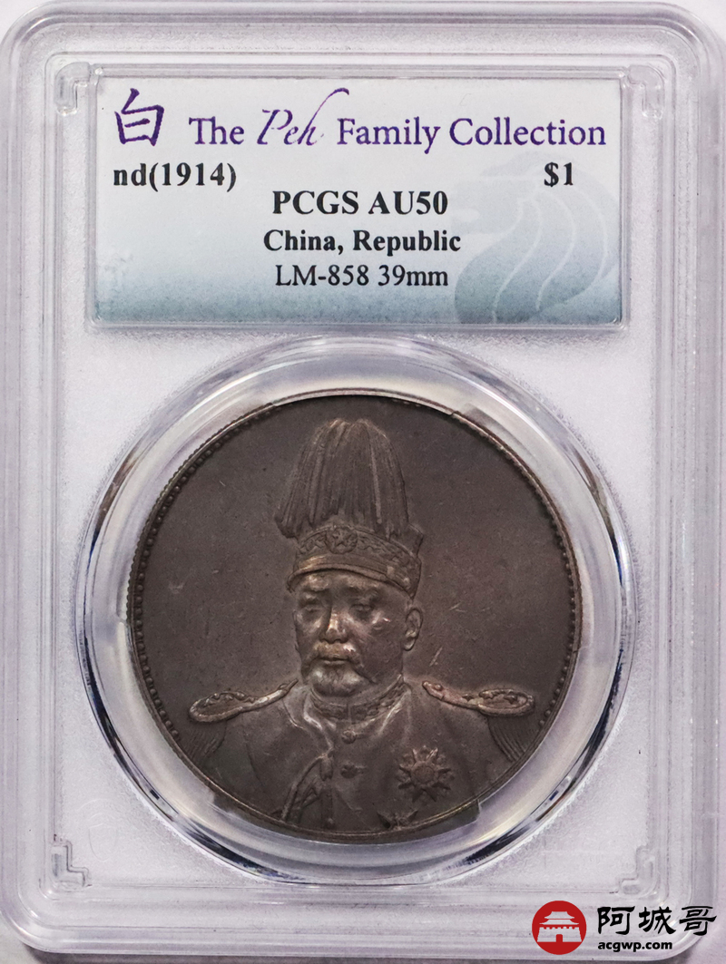 Lot:3153 1914年袁世凯像共和纪念壹圆银币一枚,鼻梁坚挺,铸打压力十足,咖啡色包浆,味道一流,新加坡船王白先生旧藏 PCGS AU50评级编号:48332488