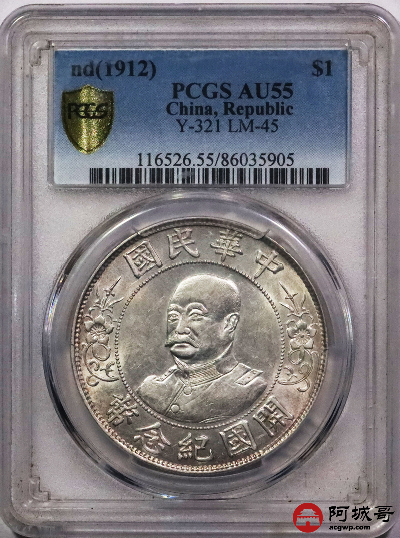 Lot:3098 1912黎元洪像无帽开国纪念壹圆银币一枚,原光状态PCGS AU55评级编号:86035905