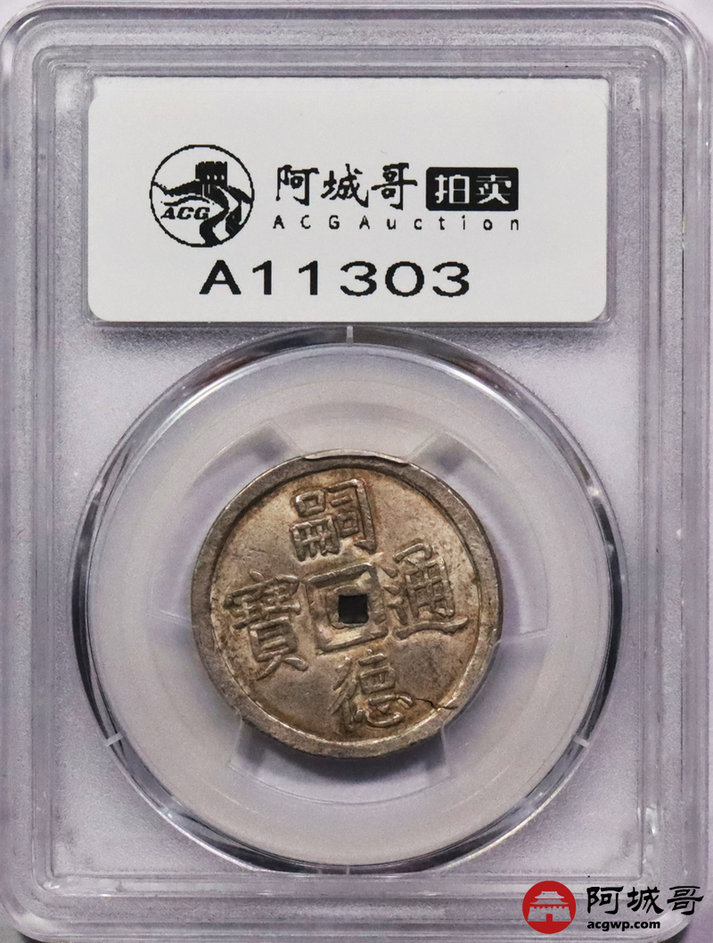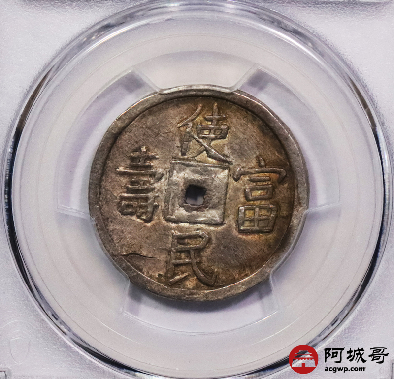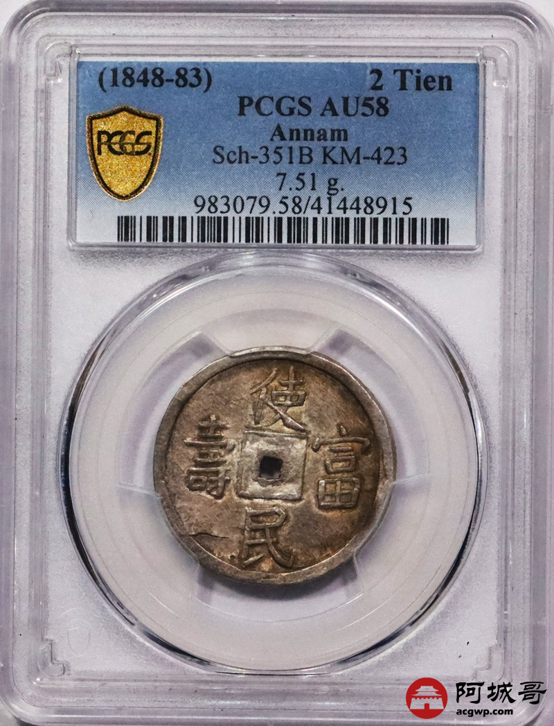 Lot:3443 安南 使民富寿 嗣德通宝银质花钱一枚,黄油淡彩底板 PCGS AU58评级编号:41448915