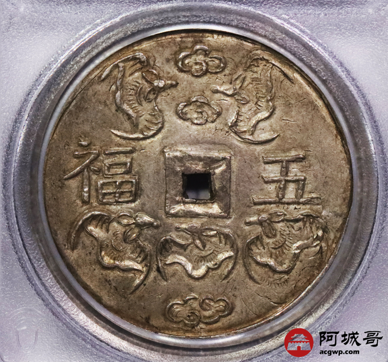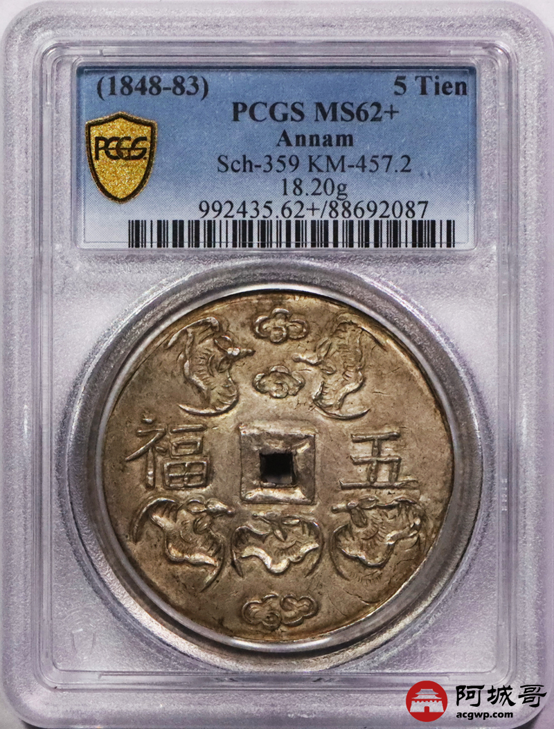 Lot:3442 1848-83安南嗣德通宝五福。重18.20克。祥云环绕顶部两隻蝙蝠,正面五福,云中可见两隻蝙蝠,下方云中有三蝠,反面嗣德通宝,黄油包浆,状态完美PCGS MS62+