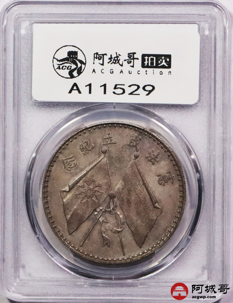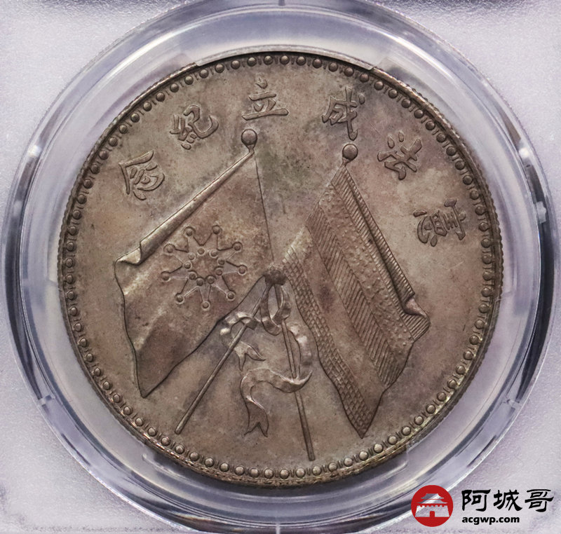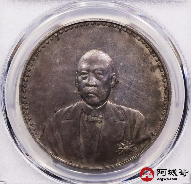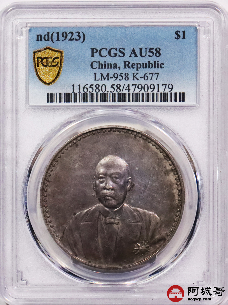 Lot:3160 1923年文装曹锟纪念壹圆银币一枚,铸打深俊,镜面粉彩底板,状态上佳 PCGS AU58 评级编号:47909179