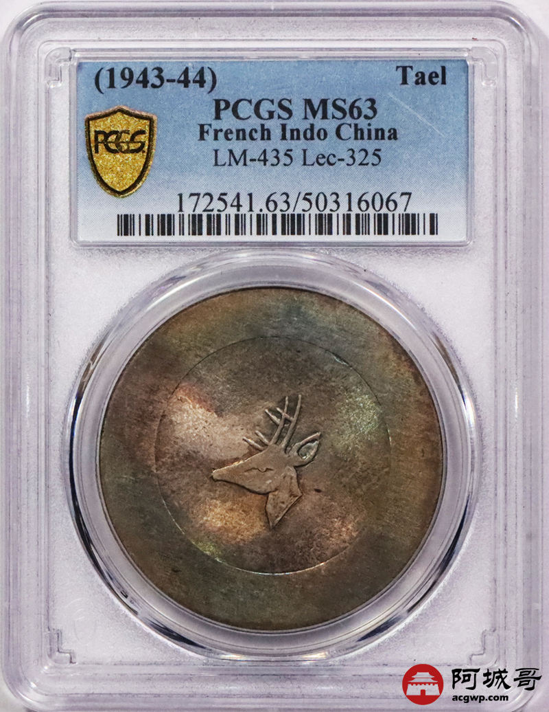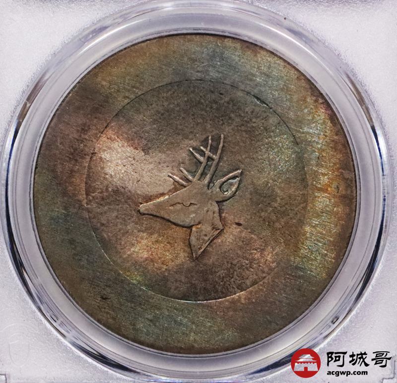 Lot:3421 1943-44云南省造正银一两小鹿头银币一枚,车轮转光,底板清新翠绿彩浆,状态一流 PCGS MS63 评级编号:50316067