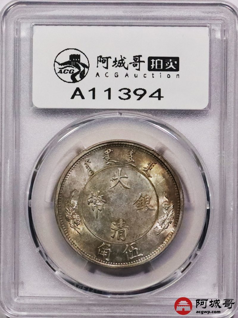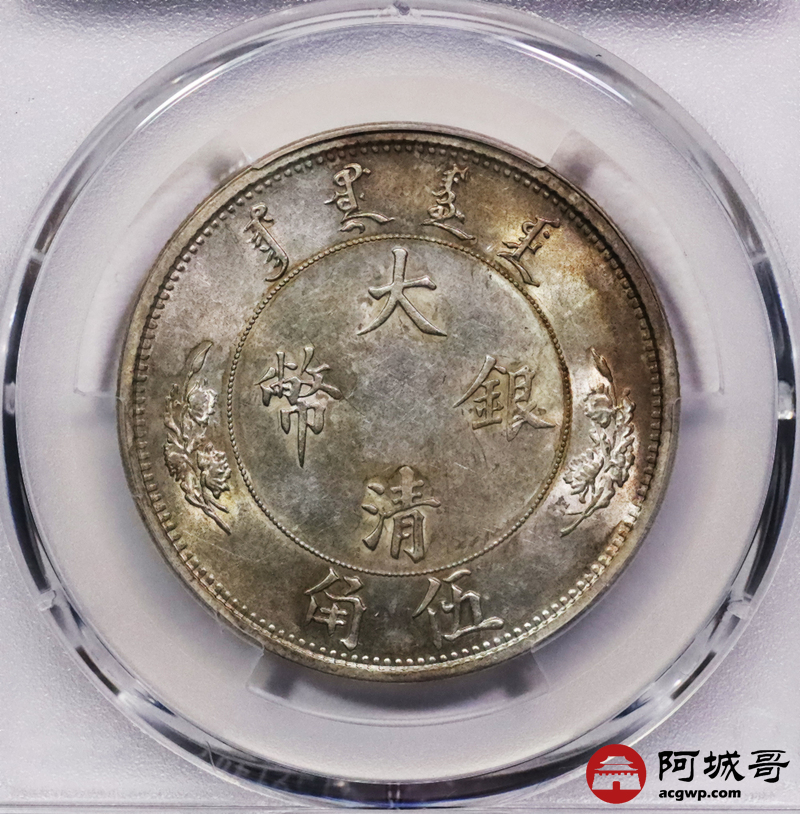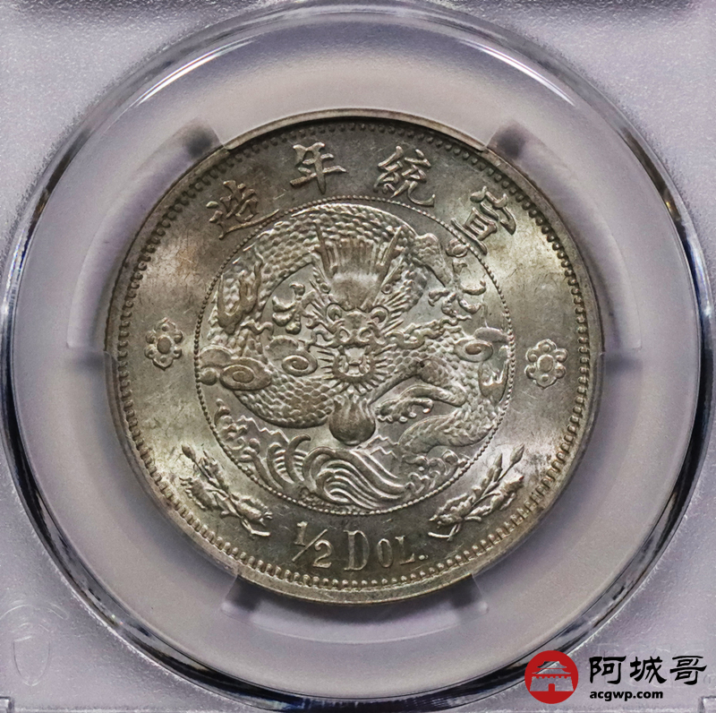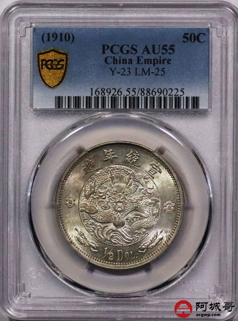 Lot:3068 1910宣统二年大清银币伍角一枚,水龙系列银币由奥地利维也纳造币厂设计制模,打制深俊,龙图饱满,黄油淡彩底板,保存状态完好 PCGS AU55